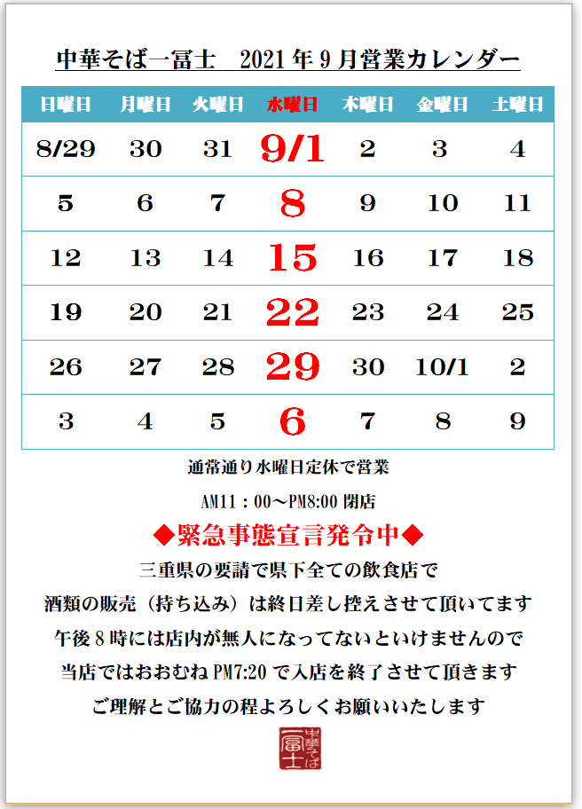 当店では緊急事態宣言中(8/27~9/12)、三重県からの要請に則り、酒類の販売・持ち込みを終日差し控えさせて頂きます。