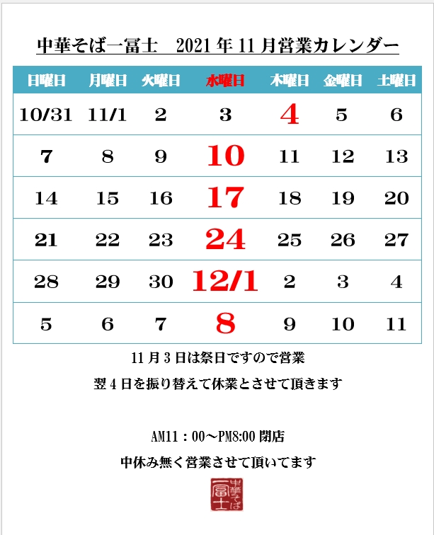 11月3日は祭日ですので営業・翌日4日を振り替え休業とさせて頂きます