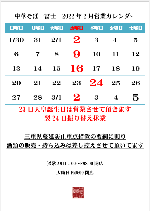 2月23日水曜日(天皇誕生日)は、営業、翌24日木曜日に振り替え休業とさせて頂きます。