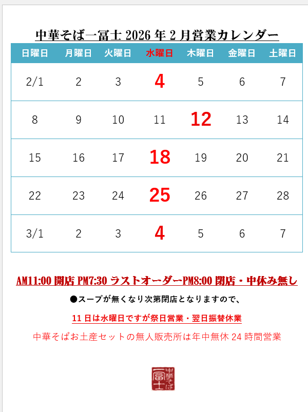 2月11日(水)は祭日ですので営業、翌12日振替休業