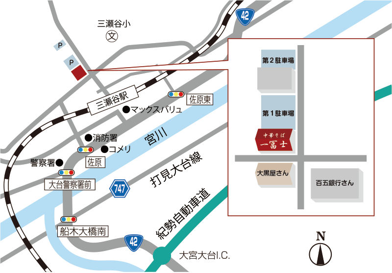 ●「JR三瀬谷駅」より徒歩2分 ●紀勢自動車道「大宮大台I.C.」下車、 42号を津・松阪方面へ左折、佐原交差点を 左折後右折すぐ ※下記GoogleMap参照
