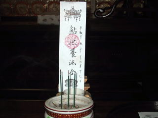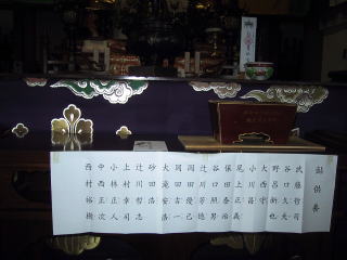 | 時間は午後4時、 とにかくお寺って寒い!! 和尚様がみえるまでに準備です。 七鮎会のメンバーを書いた紙を祭壇に貼り、 もちろん御布施もキッチリいたします。 祭壇にはチャンと 鮎様の位牌 がまつられてるんですw(゜o゜)w |