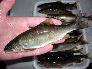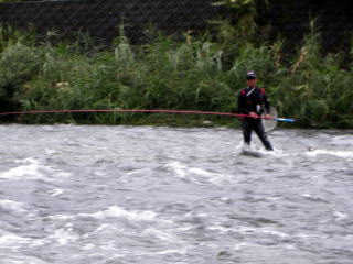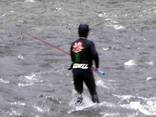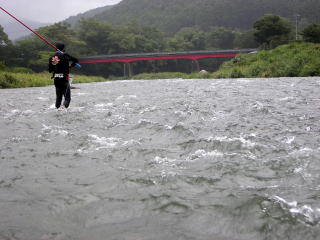 旅日記作家こてつ@42歳 コレが私のもう一つの肩書きです。 色んな顔を持ちすぎて、自分が何者なのか分からなくなってる42歳。 こんな私の書く旅日記を鮎の釣果報告日誌と勘違いされ 多数の鮎師の方々が本業のお店に御来店いただけます。 ちゃんと仕事してるこてつ42歳。 先日も、4人組の鮎師の御客様に御来店頂いたのですが 着てる服で鮎師さんって分かるんですよ。 で、4人揃いもそろって悪役商会の人の顔みたいな(・∀・;)・・・・・ 思うんですけどね、釣りする人ってガラ悪い人多くない?Σ( ̄□ ̄;) お店は国道から一本入った路地裏ですので 通りすがりで立ち寄った訳ではございませんよね。 明らかに何かを見て(ココ)来て頂いたんでしょう。 そんな予想も的中し、帰り際にボスらしきスキンヘッドの悪役がね 「インターネット書いてるのこの子か(メ-_-)」 って、調理場に顔を突っ込んでおっしゃるんです。 こ・・・この子ってなに(゜Д゜≡゜Д゜)? 42歳なんだよ!ボクヽ(`□´)ノ ちなみに ![]() そして ![]() 二人の子供を抱え込み、結構大変な状況で生きてるんだよ!私はだヽ(`д´;)/ そして、悪役のボス@スキンヘッドに、私はこう言い放った!! 「あ・・また今度色々教えて下さいね(;^。^)ヘラヘラ」 とっても恐かったです・・・_| ̄|○ そんなヨワヨワなこてつ君。 今週の釣行は、ブラックと休みが合ったので熊野川と予定してたのですが この地方を襲った集中豪雨。 河川の増水・通行止め・土砂災害・・・・・ 何一つ、好条件が出てこない(`⌒´) 最後まで遠征にこだわるブラックを説き伏せ、地元河川で待機する事にし車中泊(笑 だってね、あの雨ですよ。 地元に居れば、川がダメでもお楽しみは何でもあります^^ 増水してたら、のんびりパチンコでもすっかな。 とか思ってたら、ピンクからのラブメール(爆 どうやら仕事明けで大内山川に出撃する様だ。 車中で寝てても、時折激しく降る雨。そして唸る暴風ヽ(;´Д`)ノ、 朝方になってもやむ事の無い風雨。 しかし、増水してるものの川は笹濁り。 朝一情報をピンクにメールするものの返事が無い。 さてと、どうしたものか(-_-)y-~~~ 天気が回復するのか、これから荒れるのか。 濁りはこれからどうなるのだろうか。 いや、そんな事より こんな日に竿出して世間に笑われないのか(爆 色々思い巡らせながら、阿曽~大内山まで巡回してみますが 川に人影は何もありません。 やはり、今日は普通竿出さないよなヽ(゜▽、゜)ノ 帰路に着きながら、阿曽大橋を通過しようとすると 一人の知らない鮎師さんが竿を出されてました。 おったか・・・阿呆が・・・・(涙 コレで帰る訳にはいかなくなってしまいましたヽ(;´Д`)ノ、 こう見えて、私「関西激流隊」だったんですよね? 私が今目にしている激流は、本物の隊員にはチャラ瀬(汗 「あのね、増水してたから帰ったの(*´∀`)ノハハハ」 とか言う勇気が私にはございませんでした。 この隊員の皆様も悪役商会が揃ってます_| ̄|○ しかも、顔だけではもの足らず、口も悪役(爆 仕方ない・・・チョッとだけやるか・・・・(・∀・;)・・・・・ そんな熱い思いを胸に阿曽大橋上流に入りました。 8:30 ![]() 写真は午後の部のピンクです 丁度、ピンクの立ってる辺りにさっきのオジサンが入ってましたので 私はズット上流の通称「こてつの窪み」を目指し遡上ました。 ここに辿り着くまでに体力の半分は消耗しました(笑 仕掛けは0.125メタル@岡村工房 朝はね、写真より20センチは水高かったの。 遠くに見えるピーヤが水没したら止めるつもりで友釣り開始ヽ(`д´;)/ サクッと1匹目・・・小さい・・・サクッと2匹目・・・小さい・・・ やはり「こてつの窪み」からでは待避中のチビしか掛からない様だ。 意を決し、ドンブリコしてる上の瀬に鉛を付けてチビ投入するも入りません。 大き目の養殖に交換し、ジリジリ引き上げると ガッ!! 大急ぎで「こてつの窪み」付近まで下がってドスンとタモに収まった25センチ級^^ ソレを囮に再度瀬を引き上げて行きます。 ガガッ!! 速攻で来ました。デカイでコレ(*`Д´)ノ" ですが、この時まだ今日の仕掛けの物凄さを知らぬ私。 「切れたらどうしようΣ( ̄□ ̄;)」 この思いが頭をよぎります。 迷いが生じると、ロクな事がありません。 案の定、キャッチミスヽ(;´Д`)ノ、 今日の様な状況で、元気な囮が廻って行かないのは致命的。 再度、養殖に付け替え、さっきのおじさんの近くまで釣り下がっていきました。 キャッチミスをあと2回程したでしょうか?(笑 その頃になって、対岸に見覚えのある悪人顔が・・・いや激流隊員が。 今まで2回御一緒させて頂いたクワちゃんだ。 って事は、間もなくピンクも来るって事か? とか思ってるうちに10:30ピンク登場♪ 私に会えた喜びを隠し切れないのか、対岸から何か叫んでます(*v.v)。 「囮あるか(゜Д゜≡゜Д゜)?」 色気もへったくれも無い男です┗(-_-;)┛ 「もうフラフラのなら^^;」 そのフラフラ君を取りに来て、ピンクも釣り開始です。 私が攻めきれなか