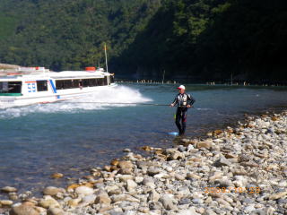 とうとうこの日がやってきました・・・・・ 2009夏の陣 好条件戦隊こてレンジャー納竿の儀ヽ(;´Д`)ノ、 思い起こせば今年も皆様のお陰で 色んな経験をさせて頂きました。 宮川での好条件CUP(笑 九頭竜川で九頭竜返しを決めるの巻ヽ(゜▽、゜)ノ そして普段の釣りでも色んな人に御迷惑をかけつつ 何とかこの夏の最後を迎える事が出来ました。 そして最終釣行もやはり車中泊(*v.v)。 午前4:30 三重県北部から@メガトン隊員到着! 同じく三重県北部から@気まぐれ翁隊員到着! そして今回も私のセバスチャン@おまけくん登場! 約束の時間は午前5時。 各隊員、最終釣行に向け気合十分の様で 隊長である私もおのずと気合が乗ってきたヽ(`д´;)/ ほんで、なに? 集合時間決めた@ピンク隊員到着がAM5:30って(゜Д゜≡゜Д゜)? 「いや、3時半には起きてたんやで(・∀・;)・・・・・」 訳の分からぬ言い訳をする@ピンクを後部座席に押し込み いざ熊野川に出発だい! 今回は最初から運転手を買って出た@おまけくん。 いつも運転ありがとうね。 来年は九頭竜まで運転させてあげるからね(爆 そんな勤勉な@おまけくんとは対照的に 後部座席で朝っぱらから呑み始めるピンク_| ̄|○ 帰りは呑めないから仕方ないか( *~□ゞぐびぐびっ ( *~∇~)□ そうこうするうちに 崖上にそびえ立つ日本一豪華な囮屋さん 「浪花囮販売所」に到着。 宮殿が立派なだけでなく ココの囮の入れ物?がこれまた凄いんですわ。 百聞は一見にしかず!見に行ってきて(笑 「ピチピチの熊野美人揃えてあるで(^o^)/~~~」 おっちゃんの言葉に偽り無し! この時期にこんな囮が揃うのかって位見事な囮!!! 5人で10匹。しかも1匹おまけしてくれた。 そこで@メガトン隊員が一言 「コレはこてつさん用ですね(=^v^=)」 っと、この一言に反応したおっちゃん。 「あんたがあのラーメン屋の人か?(>з<)=зウホッ」 私、囮屋さんで騒ぐのは「宮川インフォ(大原囮販売所)だけなんです。 他所では只の通りすがりの友釣り師でいます。 だって、大概いい加減な事書いてますので 何処でどんな恨み&苦情を買ってるかと思うと なるべく本性を知られてはいけないのだ( ▽|||) しかもこのおっちゃんに関してはだ 前回 ![]() この様な刺激的な紹介をしているだけに 流石の私もどう対応して良いのか分からず 「あ・・・この人たち皆激流隊なんです(^_^;へへへ」 と、話題を変えるのに必死(鬼汗 まさか、なにわのおっちゃんがネットしてるとも思えない。(してるの?) 誰や!何かゆ~~たんわΣ( ̄□ ̄;) 今回もこてつ君がナイスな紹介してたと 言っておいてください(爆 さてそんな一行が三和大橋の上で目にしたものは ![]() まさかの大濁りの熊野川_| ̄|○ 今年はどうもココって時に 自然が味方をしてくれない年でした・・・・・ 結局「小舟」でお茶を濁す事に。 まぁ、今日は祭り! 竿を出せるだけでOKでしょう(*´∀`)ノって事で。 ![]() 各隊員に本日の任務を説明する私。 入れ掛かりのピンポイントも一通り伝授し さぁ!みんな!!攻撃開始だぁε=(>ε<) プッー! おい!こらヽ(`д´;)/ @メガトン隊員が上の瀬肩に向かって歩いていくぞ! 写真で私が指差してるのは下流。 俺の話聞いてなかったんかヽ(`□´)ノキー まぁエエわ。 彼はいつも私の囮確保してきてくれるから許したろ(^^; 道中ですっかり出来上がったピンクと 運転で疲れた気まぐれ翁隊員を残し 私も目の前の瀬尻で竿を出しました。 開始1分。 もう釣れちゃった、ボク(〃^∇^)o_彡☆ 小ぶりの鮎でしたが この状況で肝心なのは 隊員の前でエエとこ見せる俺の存在(爆 このパフォーマンスで一気に隊員の士気も急上昇↑↑ そこに先発で熊野に乗り込んでた フィッシング遊・アサヒの@めろん♪隊員も合流(>y<) 何だか賑やかになってきたぞぉ~~~v(=∩_∩=)v ![]() 今年は絶好調でアチコチの大会で優勝をしてきた@メガトン隊員。 この日も着々と掛けてましたよ。 ![]() 熊野を徘徊する@気まぐれ翁隊員。 先日竿納め宣言した夏は川漁師さんが幽体離脱すると 好条件戦隊こてレンジャー@気まぐれ翁隊員になります。 ![]() 毎度お馴染み@ピンク隊員。 まさかこんな所で竿を出すとは思ってませんでしたので 激流スーツのみの装備しか持ってこなかった(笑 ![]() @おまけ隊員 友釣り2年目にしてその知識は私の数十倍(爆 後は釣果だぞ(*´∀`)ノ ![]() ちょっと小さいけど@めろん♪隊員。 その持って生まれたアイドル性のせいで 今私の存在を一番危ぶませるポジションに居る男だ(`へ´) ![]() 私ことレッド隊長。 硬い竿は結局修理が間に合わず残念でしたが 今年からの相棒、VARIVASの赤で頑張ってきました。 それぞれが今年最後の友釣りを楽しみ これまたお楽しみのランチタイム(≧∇≦) ![]() この日の為に釣ってきたアオリイカを刺身にするピンク。 その傍らではカブリツキの特等席でお箸を用意して待つ@めろん♪隊員。 「控え目ながらもキッチリツボは押さえる、」やはり危険な存在だ(爆 ![]() やはり川に居るよりこの状況が一番似合います。@メガトン隊員(笑 呑んで喰って いよいよ本当の最