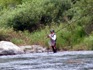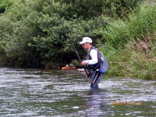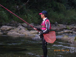 (自称)伝説の鮎師@こてつ(-_-)y-~~~ 先日近所の鮎師@ゆうき君がこんな話をしてきた。 落瀬橋から増水中の大内山川を見下ろし 夕涼みがてら友釣りの風景を楽しむ地元民。 川の状況は超激流。 どの鮎師も陸から、もしくはヘチに立ち何とか芯に囮を入れようと苦戦中。 そんな中一人の鮎師が 激流のド真ん中に立ち込み大暴れヽ(`д´;)/ 見ている地元民も流石に驚嘆していたらしい。 当然 「いったい誰ね!あれは!(゜Д゜≡゜Д゜)?」 と、話の流れはそうなるのが常。 その場に居た事情通がポツリと一言 「アレはな 一冨士のこてつ君や(*`Д´)ノ"」 キタ━━━━(゜∀゜)━━━━!!!!!! ゆうき君は呑みに行った阿曽の料理店「やまさ」で大将からその噂話を聞いたらしい。 しかし、その勇ましい鮎師が出没したのは火曜日(爆 別名「ビックウェンズテ~こてつ」の私。 水曜日以外に川に居る事は有り得ないのだ。 誰?俺の影武者は(゜Д゜≡゜Д゜)? まぁエエわ。 伝説ちゅうモンは出所は怪しいほど信憑性が高くなるモンなのだ(笑 @影武者隊員(笑 今度名乗り出てください。 是非、お友達になりましょうヽ(゜▽、゜)ノ さて、伝説街道まっしぐらのこてつ。 今週は、滋賀県の刺客「のんちゃん」が前夜からやってきた。 当然前夜から@クリア隊員とその妻@エリザベス隊員を交え懇親会(*v.v)。 遠くからお越しのお客様には もちろん私の釣果も持って行って頂く事になる。 @クリア隊員曰く 「明日はこてつ20匹。のんちゃん10匹がノルマやな(*´∀`)ノ」 そういって、複合0.07を1つくれた。 私の仕掛け構成は、複合0.05の次は複合0.15まで大きく飛ぶ(爆 この中間の仕掛けは実にありがたかった。 万一に備え、毎度お馴染みの ピンク・ブラック・おまけ隊員にも出動要請はしてあるソツのないこてつ^^; 実は単独なら「宮川」って思ってました。 そろそろ垢も付きはじめたかな?みたいな。 しかし、少し早かったら地獄行き決定。 遠方の方を一か八かの賭けに連れて行くわけにはいきません。 そんな理由で大内山川。 堅調な釣果を誇る平瀬橋に入る事にしました。 ![]() 地形と掛るポイントをザット説明し のんちゃんは、橋の下流、私は上流部へと旅立ちました。 とりあえず鉄板ポイントで数を稼ごうと 囮をセットしようとして愕然としました。 2匹ともほぼ昇天( ▽|||) そういえば囮屋さんが 「チョッと弱いから選んでねp(^-^)q とか言ってくれてるのに、強気な私は 「ほんなモン、入れたら即やし、1匹あったら充分やし、伝説の鮎師やし(≧∇≦)ウキャ~~」 みたいな(爆 な~~んも選ばずに2匹入れたのがこの始末_| ̄|○ 今更どうにもならないので 緩い流れに入れるものの、囮が流れていくだけ^^; チビオモリを付けて流れのヘチに沈めてようやく掛った1匹目。 腹部より大量出血大サービス(・∀・;)・・・・・ それでもまだ息はしてる様なので コレってポイントで勝負を賭けるべく川原を歩きます。 ![]() 私の信条は、「車の近くで釣る」ですので こんな上流まで歩いたのは初めて(^^)ゞ 引き舟の中に手を突っ込んでみると 案の定というか、まさかと言うか、3匹とも動いてません(涙 レッド隊長緊急援助信号発射(*`Д´)ノ" ピンクに連絡するものの、中止だった訓練が出来る様になって出動が遅れるとか・・・・ ブラックに連絡するものの、近所に不幸があって本日出動不可能ヽ(;´Д`)ノ、 ナッシー君と連絡するものの、まだ家にいるらしい┗(-_-;)┛ おまけ君に連絡すると、子供に御飯食べさせてから出動(・∀・;)・・・・・ ドイツもコイツも当てにならない隊員だ(`⌒´メ) のんちゃんもパットせず、って言うか 他所から来たのんちゃんに囮もらったらアカンでしょ(爆 いつもの様にスネて橋の影でオヤツを食べてると 橋の上から私を呼ぶ声がした 「隊長!大丈夫ですかヽ(`д´;)/」 おお!キミは@おまけ君(T-T) どうやら子供の食事より私のピンチの方が 彼の人生において重大事だった様だ(汗 そして、@おまけくんの友人 好条件戦隊こてレンジャー@シークレット隊員のペット囮を持ってきてくれる事になった。 初登場の@シークレット隊員。 バリバリの地元諜報員。マイ囮を常にペットとして保持する秘密の隊員なのだ。 むろん、元気ビンビンの天然だぁ~~~v(*∩.∩*)v 勝手に持って行ってごめんね(^^)ゞ 待つ事十数分。 「待たせすぎやで!(`´)ノ☆(((*;・)」 いや、こういう時は例え私に奉仕するのが宿命の隊員といえども キッチリお礼を言えるこてつです。 ありがとう!おまけくんm(_ _)m 何故時間が掛かったかというと、良さそうな場所を見てきてくれていたのだ。 家ではお腹空かせた子供が待ってるというのに(鬼汗 のんちゃんもパットせず、場所移動決定。 おまけくんお奨めの「小広瀬橋」 入りたかった場所は人が居たので、上流部へ入りました。 通常ココで長~~~いランチタイムになるのですが オニギリを歩きながら頬張るのんちゃんΣ( ̄□ ̄;) 流石、鮎釣りの好きな人は違いますね。 私はキッチリ、良く冷えたザルそばとオニギリを 車の後ろに腰掛けてモグ