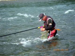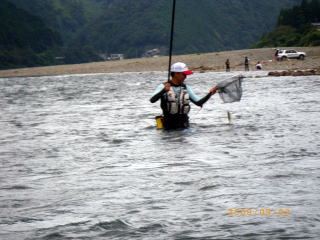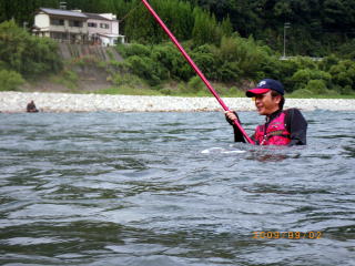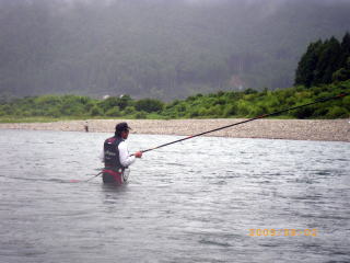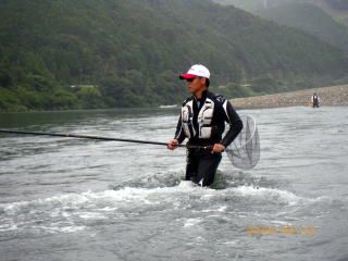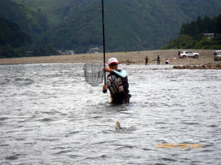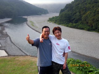 ようやくモロモロの鮎関係行事も済み ようやく自由に動きが取れる様になった訳で(^u^) 先週予告した通り、今週は 好条件戦隊こてレンジャー慰安旅行の巻! のはずだったのですが・・・ 実は私の中では本日九頭竜川デビューの日になる予定でしたが このタイミングで熊野方面が爆発し始めてしまってね。 ソレはソレでOKなんですけど こうなるとココラの激流隊の皆さんのお尻がムズムズするみたいでね(笑 当初、私・ピンク・おまけ君の3人での慰安旅行のはずが 総勢6人での釣行となった次第でして・・・・ その中には 関西激流隊総括隊長@マーシー様も居たりして・・・・ 慰安旅行のはずが 激流修行に早代わりΣ( ̄□ ̄;) しかも、ピンクはみんなの囮を用意する為に 前日から現地入りする気合の入れ様(爆 そんなピンクを川原に残し帰って来た まっちゃ亭のtaka君&ナッシー君が店に寄ってくれてね 「こてっちゃん用に25センチの囮未使用で置いてきたでな(*´∀`)ノ」 と、いつもいつもありがたい御好意ヽ(゜▽、゜)ノ 一気にヤル気マンマン! ピンクが前日出動って事で、コッチからは 私・マーシー隊長・おまけ君の3人で出動です(*`Д´)ノ" マーシー隊長との待ち合わせはAM4:00。 普段ブラックやピンクと待ち合わせの時は 「車で寝てるから起こしてね(-_-)zzZZ」 っと、モーニングコールがあるまで爆睡してるのですが 今回峠の向こうからやってくるマーシー隊長は そんな事を言うには恐れ多いオーラを放つ方なのだ{{(>_<)}} いつもならグッスリ眠れる車中泊。 しかし今回は、何度も何度も目が覚め時計を見てまた寝て 夢の中でサクサク荷物を積み込むシュミレーションまでしてたこてつ(涙 AM3:30 まだ30分あったが車外に出て直立不動で隊長を待つこてつ(爆 「今日はお願いしますぅ~~こてつ君( ̄ー ̄)ニヤリ」 いつものあの悪い事企んでる笑顔で登場のマーシー隊長・・・・ 今日も何か悪い企んでるのか、車に乗ってからも謎の紐を ニヤニヤしながら手でもてあそんでいるのだ! こ・・・殺されるのか?俺は.....(((((ノ><)ノ @おまけ君を迎えに行くまでの10分間で 神経をすり減らしきったこてつ_| ̄|○ @おまけ君を乗せ、ようやく落ち着きを取り戻すこてつ。 そうなると心にも余裕が出てきて 改めて今日の目標なんかも考えたりして。 今日の目標 この絶滅危惧種の猛獣を飼いならすぞぉ~ヽ(゜▽、゜)ノ 関西激流隊総括隊長の看板を背負っているマーシー隊長ですが 実は好条件戦隊こてレンジャー@ブルーサファイヤ隊員だったりもするのだ。 前から思ってたんですけどね 友釣りする人に限らず、釣りするオッちゃん達って柄悪くない? 私の周りだけですか? ちなみに私は吹けば飛ぶ様な好中年のダンディ。 出来れば我が戦隊員には 爽やかで清清しいイメージを大事にしてもらいたいのだ。 その為の作戦を練りながら一路熊野へ。 途中、さぎりの里で記念撮影(笑 そんでもって竹筒でも記念撮影・・・・ この記念撮影一つにしても爽やかさを大事にしたいのだ。 マーシー隊長が普段普通に撮る記念撮影はこうだ ![]() ダメダメェ~~~~そんなカッコしちゃぁ~ 殺気が漂ってますってばヽ(;´Д`)ノ、 お隣(左)は激流隊の一番偉い人。 ほらコレ見て ![]() @おまけ君と私。 ほらぁ~~朝から清清しいでしょ~~~ヽ(゜▽、゜)ノ もう幼馴染みたいでしょぉ~~腰に手回ってるしさぁ~ 昨年知り合っただけとは思えませんね(爆 とりあえず、写真撮影の見本を見せてっと マーシー隊長とも記念撮影 ![]() ほらぁ~~やったら出来るじゃん、ぎこちないけど(爆 急にガシって肩組んで来るから 俺ビビッてちょっと腰引けちゃってます(・∀・;)・・・・・ 泣きそうになってるし(涙 そんな道中に疲れ果て、ピンクの眠る川原に到着した時には 既に@気まぐれ翁隊員(夏は川漁師)と@メガトン隊員(deibu)両隊員も待っていた。 どうやらこの二人は違う漁場にて竿を出す様で サッサとピンクの用意した囮を持って出陣。 私達4名は当然「瀬」関係の充実した漁場へ・・・・ ![]() ここです。 ピンク&takaくん&ナッシーくんの用意してくれた囮を配分して ようやく釣り開始です(笑 さてと、ボクの25センチ未使用の囮はどこかなぁ(*´∀`)ノ どうやら先に行った二人が持ってたみたいで 普通の囮しか残ってませんでした^^; ![]() いきなりオモリを付けて瀬を攻めるマーシー隊長。 通常緩い流れで囮を取ってとかするかと思うのですが この流派の釣りはとにかく瀬です。 どうやら2号玉が2個付いてる様でしたので 私もソレにならい、固い竿に複合2号に8号3チラ、2号玉2個付けてスタート。 今年初の熊野川。 何か違う喜びが湧き上がってくる川ですね♪ 囮を沈めて引く事数回。 ズリ~~ン って感じで目印が流れ出します。 竿を立てると難なく飛んできた坊主ハゼ_| ̄|○ しかも3連発_| ̄|○_| ̄|○_| ̄|○ どうやら何かの呪いは解けていない様だ・・・ 動かなくなった囮を交換し、再度瀬に入れると根掛かり_| ̄|○ 通常切ってしまうのですが、何とか回収できそうな場所に引っかかっている。 必死