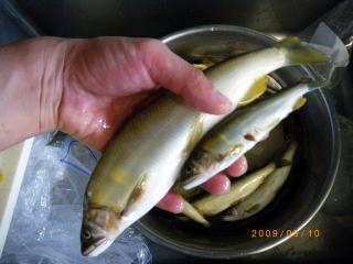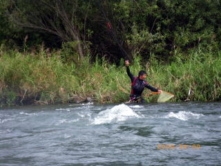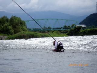 思い起こせば今年は2009年7月22日 皆既日食という歴史的瞬間に竿を出していた。 そして今回 2009年9月9日 999で確率変動突入という記念すべき日。 こんだけ9が揃ったら行かねばならない川があった こてつ君(元チャピチャピの王子様) 九頭竜川に拉致の巻( ▽|||) てっきり熊野に行くものと思ってましたが 九頭竜川に火曜日から行ってる まっちゃ亭のtaka君&ナッシー君コンビが 囮20匹確保してあります(*`Д´)ノ" って連絡来たもんだから、急遽「九頭竜遠征」となった次第で・・・・ 九頭竜川と言えば激流の聖地。 一度は行って見たいものの片道300キロ。 連休の無い私には体力的に二の足を踏む距離。 しかし、近年の我が好条件戦隊の充実したサポート体制(笑 キッチリ運転手にはブラック隊員採用ヽ(`д´;)/ そして現地でのサポート役にはピンク(*v.v)。 完璧な態勢も整い前夜は興奮して眠れないからチョッとパチンコ(笑 ![]() キッチリ999でサム出現ヽ(゜▽、゜)ノ $箱積み上げ、その勢いでハッスルコース(*v.v)。 今夜の宿(集合場所)に帰ってきたら ブラックも何故か車中泊してました(爆 ピンクからのモーニングコールが来たのがAM3:06 どうやら早く着いたが針や仕掛けをこしらえていたらしい(笑 荷物を積み込みAM3:30 いざ、九頭竜川へ出発だいo(><o)(o><)o 何故か運転手は私だった・・・・ 流石に往復600キロを一人では可愛そうですので 行ける所まで運転を買って出た優しさを持ち合わすイカシタ俺(^o^)y-~~~ 九頭竜川は福井県。 福井県といえばソースカツ丼。 朝食はやっぱりソースカツ丼しかないのだ。 ソースカツ丼をSAで食べるまで運転しました。 そこからウトウトしてたらあっという間に現地着(笑 イメージ的に、荒々しい岩山から流れ出す激流かと思ってたのですが 金八先生の登下校シーンに出てくる様な河川敷。 芝生なんか生えちゃって、道も遊歩道みたいに舗装されてて そのすぐ下が川。 荷物の多い鮎の友釣りにはもってこいの好条件。 そんなのどかな風景の中で 朝から火炊いて鍋で変なモノ煮て生活しているみたいな人が居た。 taka&ナッシーと地元のおっちゃん(九頭竜激流隊隊長らしい?)だ(爆 挨拶なんかしてると、見た事ある人が車でやってきた。 フィッシング遊・アサヒの@めろん♪隊員とコ~ギ~氏だ。 @めろん♪隊員とは1年ぶりの再会。 コ~ギ~氏とは初対面(*v.v)。 これで総勢7名での釣りとなりました。 ![]() 場所は中ノ島? そこにマーシー隊長から祝電(・∀・;)・・・・・ 「目の前の分流切って中洲の下まで行って川切ってなぁ~~(`⌒´メ)」 確かに目の前には分流らしき流れがあるにはある。 しかし、ソレは本流と比較しての分流であって いつも釣りしてる宮川や大内山川と同じ川幅があるのだ。 そう、今回の九頭竜川。 とにかく川幅が広い広い。 中洲が点在してて、それで大内山川3本位に分けられてたり またその3本が1本にまとまったり、また分かれたりしながら 変化に富んだ川相を形成している気がした。 そんな事してる間に、私の車から引き舟が運び出され 知らぬ間に囮も分けてもらっていた。 至れり尽くせりとは正にこの事だ(>y<) さぁ、後は釣るだけ。 本日の目標 九頭竜川で九頭竜返しをキメル(V^-°) はい、今年はコレだけに焦点を絞り込み 地元河川でも返し抜きの練習に専念してきたのは言うまでもございませんね(爆 分流とはいえ立派な川。 なるべく緩い流れで浅い所を選び、川切り開始。 もちろん先にブラックを行かせ様子を見る用心深いこてつ(笑 そして何とか辿り着いたのがココ ![]() とてつもなく広いです。 仕掛けは03複合に9号3チラ、オモリは2号2個で釣り開始。 囮が底に沈んだ途端 いきなりの当り(☆_☆) グッと我慢して鮎が浮いてくるまで耐えます。 そんなに大きくなかったのか、少し引きづられただけで浮いてきた(笑 ここで迷いの生じたこてつ。 「朝っぱらから九頭竜返しか?(゜Д゜≡゜Д゜)? 成功率は50パーセントやぞ・・・・・ ナンボ今日は囮捕獲班が大勢待機してるとはいえ 毎回毎回そんな事してたら愛想付かされるでヽ(;´Д`)ノ、 初物やし、ここは確実にいっといたほうがええんちゃうか?」 浮かせた鮎を水面ズルズル引き摺って(笑 九頭竜川初鮎ゲ~~~~~ットε=(>ε<) プッー! ![]() 背中がボディービルダーみたいに盛り上がった鮎。 結構大きかったんですね^^; コレを囮に再度底を探ります。 っといきなり目の前を横切る生命体\(〇_o)/ さ・・・・サムか?(゜Д゜≡゜Д゜)? ![]() いや、サムにしては黒い(爆 ソレは 背中に竿を刺して、クロールで川を切るナッシー君だった!ガ━━(;゜Д゜)━━ン!!・・・・ あまりに信じられない光景にカメラを出す余裕も無く立ちすくむこてつ。 そして対岸に泳ぎ着くと、」何事も無かったの如くサクサク釣りに掛るナッシー君。 ![]() 既に「泳ぐ」事が想定されてる釣りスタイルなのか 帽子なんぞはかぶっておりませんでした。 もちろん偏光サングラスなんぞ邪魔な代物なんでしょう。泳ぐにはだ! ![]() ![]() 九頭竜返しも見事に決まっってるぅぅぅ~~~(*`Д
