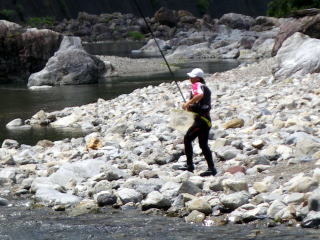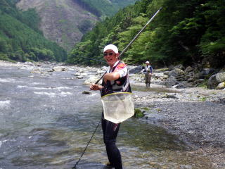 この夏一度はこの掲載を成功させたいのだ!本気で(爆 むろんコードネームでの掲載は不可なので 本名になってしまうのですけど(残念! とりあえず私だけでも先に掲載していただき その次に上記の様な掲載体制で行きたいと思っていたのだ。本気で(爆 ただ、投稿の締め切りがあるので 早目に沢山釣らなくてはいけなかったりする。 まぁ、そんなのへっちゃらだけどね(≧∇≦) そんな思惑を胸に秘め、 先行していった@めろん♪隊員を探しに行く予定が 先週やっつけられちゃった「荒瀬」が無人。 リベンジしとかなあかんやろ~~凸(-_-メ) ![]() 今年は水量も減り過ぎる事無くGOOD! 通常は対岸に渡り写真中央のガバガバの開きから釣るのですが 先週@めろん♪隊員の釣りを見て思うことがあり ![]() 坂下りたその場から開始です。 「鮎は足元から釣れ」 基本なんですよね。朝一なんかは特に。 初心に返り、ゆっくり静かに泳がせました。 数分後、目印がビビッて震えたかと思うと同時に 下流にタラァ~~って流れ始めました。 「朝は追いが悪いなΣ( ̄Д ̄|||」 貴重な1匹目。 暴れるでもなく下流へ落ちて行きます。 しっかり溜めて抜いたら只の杉の枝(涙 慎重になり過ぎたのが仇となり 囮が既にヘロヘロになっています。 開始10分もせず、囮2号発進です。 なぜ囮を2匹買うのか分かった気がしました。 舟をひっくり返し2号君をタモに入れようとしただけなのに 最後の1滴まで水を出してしまっても鮎が出てきません(爆 どうもフタが開いてたのか? それとも誰かがビックリさせようとソッと盗ってったとか? そうそう!先週ウチに空き巣入ったんやで! 何も盗られなかったけど窓割られた_| ̄|○ そんな事より、囮です。 何でかは分かりませんが1匹しか手元にありません。 しかも杉の枝釣って弱ってしまった囮です。 ![]() かなり危機的な状況になってしまったのは私にも分かりました。 釣れるか釣れないか分からない足元なんかより 対岸に渡って絶対釣れるいつもの場所に移動です(爆 フラフラと泳ぐ囮。 じっと我慢で完全囮任せで泳いでもらうしかないです。 我慢の甲斐あって程なく正真正銘鮎がヒット(*´∀`)ノ 慎重に引き抜くとしっかり背掛りで飛んできました。 が、空中でポチョン(・∀・;)・・・・・ 囮を見ると 逆針が外れてませんでした。 虫の息の囮を再度放すと 斜めになって底に沈んでました(笑 そこで、オモリを装着し アブクの中に入れて待ってると グネェ~~~~って感じで下流に流れ始めました。 エビかヽ(;´Д`)ノ、 っと思ったのですが浮いてきたのは団子になった囮と掛り鮎。 一か八かで抜きに入った所でポチョン・・・・(・∀・;)・・・・・ 流石にもう囮も動いてくれそうに無いですね_| ̄|○ 囮のお代わりでも買いに行こうかな・・・・ ちょっと休ませたら回復・・・・する訳無いよな(涙 あ~~あ誰か来ないかな(爆 念ずれば思いは天がかなえてくれます(*^-^*) 紹介します。 本日の救世主です(^o^)/~~~ ![]() 関西激流隊@はにかみ王子(笑 まだ20代なのかな? ガラと頭は悪いがお人よし(爆 崖の上から様子を聞いてきたので 「とにかく助けに来い(*`Д´)ノ"」 っと言ったら来てくれました。 腕はトーナメントでも普通に予選は通過するし パパはマスターズで全国行くし 親子で鮎の名人なんですね。 あ~~あ、エエ奴が来たわヽ(゜▽、゜)ノ とりあえず数匹釣るまで、動かない囮に錘を付け ガバガバに入れて待ってました(笑 そこへ@ブラック隊員も登場。 (遅いぞ!) ブラックと話してると、数匹釣った王子が 大王こてつ様に囮を献上しにやってきました(*v.v)。 「1匹あったらエエからな(^^;へへへ」 「そんなんアカンって! こてつさんは 何しでかすか分からんから(*`Д´)ノ"」 っと3匹舟に入れてくれました(笑 こんなお人好しです。 さぁ~~ヤル気出てきたぞ(爆 釣ったばかりの囮3匹。 これで釣れない訳が無いですよね。 それでも何度も空中でポロポロしてました・・・ 針は何度も交換しましたよ。 何でだろ?背中に掛ってるんですよ。今年は多いです。 数匹釣って、借りた囮返しても余裕が出たところで 段々瀬を攻撃しに行きました。 ![]() やはり流れのキツイ場所では 良い鮎が強烈な当りと暴れ方を楽しませてくれます♪ 良い鮎は良い囮になります(笑 通常入れ難い流れの落ち込みのギリギリの所とか 頑張って止まってシッポ振ってくれますヽ(゜▽、゜)ノ 当たり前の様に プチ入れ掛り(*v.v)。 もらった囮でも掛れば嬉しいモンですよ。 お友達と行った時はピンチになったら 助け合いましょうね^^ 朝、ひって来なかったのが仇となり 催してきたものを我慢出来なくなり2時に終了。 終ってみれば18匹の釣果。 でも今日の釣果はドーピングしてますのノーカウント┗(-_-;)┛ ![]() 根気良く丁寧につってる@はにかみ王子。 でももう用はないので、ここでさようなら(爆 何せ下から出てきてますので^^; 用を済ませほっとした所で @めろん♪隊員を発見。 彼も人が釣らないであろうチャラチャラを 丁寧に丁寧に探ってました。 私に気が付き ス