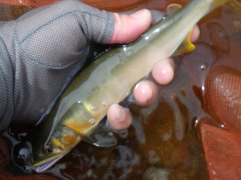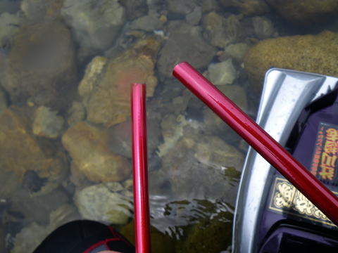先週、エネルギー切れで叶わなかった熊野行き。 今週こそはと体調を整え 祭りの準備が終ってからひた走るR42。 先週骨折した竿のパーツをもらいに 釣りエサ市場のバイヤー武ちゃん所に立ち寄った。 ココまでは先週と同じ展開だ(笑 しかし、今回は難所「矢の川峠」もクリアし どうにかこうにかも目的地に到着(*´∀`)ノ 私は平日しか釣りをしませんので 車中泊会場も空いてますが 何故か5台ほどの先客が居ました。 あれれ?そんなに状況良かったっけ(゜Д゜≡゜Д゜)? 熊野方面の情報源「oniさん」のブログからすると かなり苦戦する状況みたいな・・・・ 月・火と泊まり込みで北山退治に出掛けた ピンク隊員率いる関西激流隊の面々も 良いのか悪いのか分からないみたいな事を言ってたし・・・ 今回とりあえず下流から上がって行く予定で 新宮から熊野川を遡上して行きました。 朝起きて、道の駅下の川を見ると 予想に反して透き通っているではないですか\(◎o◎)/! んでもって ココで泊まったって事は目の前にある ![]() やっぱり囮は浪花のパパで調達ですヽ(゜▽、゜)ノ 道の駅の前にある「浪花囮販売所」 囮はもちろん、鑑札も売ってます。 ここの囮の信頼度は抜群です! パパってばオフの時期にウチに食べに来てくれてね。 見た目はアレだけど良い人なんですよ(^o^)/~~~ 今年はツーショット写真撮れるまで仲良くなるから 楽しみにしててね♪(誰が?) 私に気が付いてテンションの上がるパパとママ。 それに反し、低血圧なので朝は大人しいこてつくん(爆 しばし談笑してましたが やっぱりこの日は忙しいのか 次々お客さんが来てました。 囮を入手し、何処に入るか迷います。 気まぐれ翁隊員が良い思いをした場所は 絶対に先行者が居ます。 あ・・・既に7時過ぎです(笑 ちなみに晩にはお祭りの準備がありますので 今日は2時にて納めの予定。 結局 ![]() こんな場所から始めました。 パパの話だと、今日になって濁りもようやく取れた状況。 垢の付きはじめた場所が狙い目だとか。 ココはまだ垢付いてませんでしたが 囮1匹だけ使うつもりで竿を出しました。 もう1匹は缶に入れて温存しておきます。 車を停めた場所から開始です。 な~~~んも当たりが無いですね^^; 早々に見切るべきやな? そんな事を考え、ふと囮缶を見ると 無い!(爆 ココはジェット船も走りませんので 石を1個だけ置いて押さえた油断が裏目に出た。 大慌てで下流域に探索に出ました.....(((((ノ><)ノ 何処にも見当たりません・・・・・ 先週は骨折・・・今週は缶流出かよΣ( ̄□ ̄;) それより囮缶無かったら 場所移動も出来なくなってしまいました(汗 仕方なく?上流へと釣り上がって行きました。 最初の場所より砂利だらけ(汗 こんな場所で鮎が追うとは思えません。 囮は今ついてる1匹だけ。 このままでは早々に家に帰る事になりそうだった。 っと、そんな私の目に入ってきたのは 流されたはずの囮缶(〇o〇;) 何で? 流れたと思って下流に探しに行った囮缶が 上流へと運ばれていってたんです。 川の流れって複雑なんですね^^; ![]() 九死に一生を得た心持ちでした(笑 気分も晴れてやるきが出てきたのですが お天気はいきなり土砂降りの雨_| ̄|○ ![]() その上、上の道でトンネル掘ってるのか 腹の底に響き渡るパッパの轟音(・∀・;)・・・・・ ココには鮎は居ない(居れない!) 一通り探った後でしたが場所移動。 もちろんノーヒット(笑 三和大橋を渡り下を見ると 川底はまだ白かったですが 掛るかもしれない雰囲気もありました。 2日早かったかな・・・・ そして私が向かったのは ![]() ジェット船乗り場の上流の突き当たりの瀬。 誰も居ません( ▽|||) 友釣りに於いて 誰も居ないと言うのはかなりリスクを背負った戦いになる事が多い! でもさっきの場所から思えば 川底の色はまずまずの気がしました。 雨も上がり薄日が刺し始めてます。 囮の入りそうな流れから Meta Max008 激流長良8号3チラで開始です。 サクッと本日初の獲物は坊主ハゼ(~ヘ~;)クゥ~~ それでも生命反応があれば 何だかヤル気が出てきます。 1匹空中でバラシタ後、間髪入れず 待望の1匹目ゲットε=(>ε<) プッー! ![]() ヌルヌルピカピカの熊野の鮎ヽ(´ー`)ノ よぉ~~~~引きました。 ジアイが来たのか ココからポツポツ定期的に掛かります。 丁度ジェット船来た時に掛って抜きに入ってたの。 そしたら船長さんスロー航行してくれてね 観客の見つめる中何気に決まった返し抜きo(≧∇≦o)(o≧∇≦)o 船から写真一杯撮られちゃったし(*v.v)。 お客さん!アレ俺やってんで(*`Д´)ノ" 決まってた?最後の投げキッス(爆 こうなると気分はノリノリへ(^^ヘ)(ノ^^)ノ" ![]() 瀬の上の方は砂地で石が入ってませんでしたが 真ん中から下位で掛りました。 時刻は11時。 1時間ほどで2匹ばらしたものの 9匹ゲット出来て余裕のこてつくん(笑 少し早いけど ここで昼食にして後は2時まで頑張る事にしました。 今日のランチはぶっかけトロロうどん。 お箸でかき混ぜチュルチュル~~~~~~~~って おや?何だ? このお箸は長くて使い