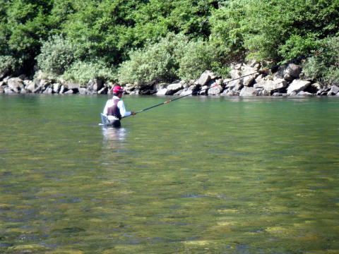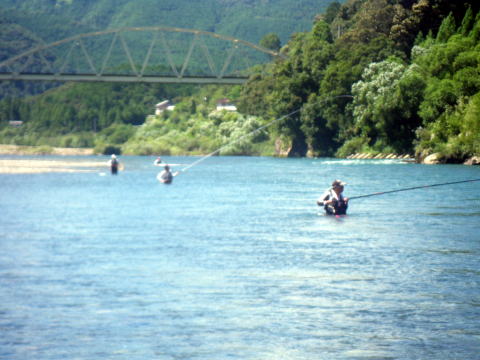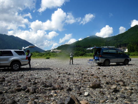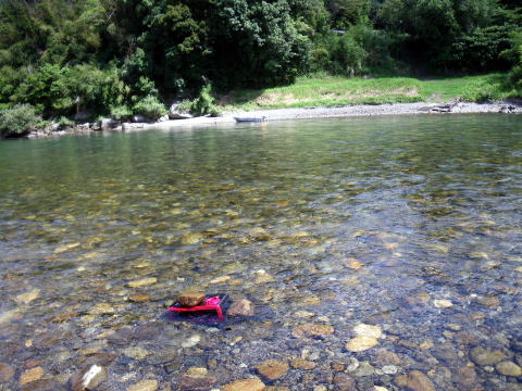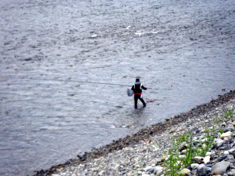 私は旅日記を釣行翌日(木曜日)に書く事が多いです。 釣行から帰って来てすぐ書く時は よほど釣果が良すぎて自慢したい時位です(笑 今年はずっと木曜日に書いてますね(・∀・;)・・・・・ さて、本日木曜日。 目が覚めて布団から起き上がるとき 全身筋肉痛で悲鳴を上げてましたヽ(;´Д`)ノ、 そんな釣行でした。今週も(爆 今週はピンクと二人っきりの釣行。 ピンクの日記読んでる方はお解りでしょうが 先週からGW並みの遠征回数を誇るピンクは今日も熊野連チャン(笑 昨日は30ほど気持ちよく抜いて ウキウキ気分で今日も熊野へひた走る車の運転手は私。 久しぶりに川原を運転させて頂きました( ̄▽+ ̄*) 浪花の囮屋さんでいつもの様に情報収集。 気まぐれ翁隊員もリハビリがてら久しぶりにココに来てるらしい。 ちょっと様子を見て行きましょうか? ![]() おった(笑 早朝からリハビリに励む翁。 神々しいものを感じましたヽ(゜▽、゜)ノ っとその時対岸に1人の釣り人が降りてきて 帽子を脱いで挨拶した?みたいなリアクション? 「あ!アレきっとブルくんやで(*´∀`)ノ」 とは言ってみたものの 先週も川で会ってますのでまさかと思いましたが 先刻食べ来てくれたんで確認したら本人でした(爆 ここんとこ赤丸急上昇中のブルくん。 すれ違いが多くまだ謎の隊員ですが 幹部候補生ですので覚えておいて下さい( ̄▽+ ̄*) 翁と軽く挨拶をして今日の作戦を伝え 私達の向かった先は、今年調子の良いいつもの瀬。 でもね ![]() こ~~~んなに減水中 └(´д`;;)へ=зムギュ~~ 土日は一日中こんな具合なの? とにかく放水始めるまではこのマンマ。 ピンクに至ってはこの水量が不満で ![]() 到着した早々、変な形してお昼寝(@ ̄ρ ̄@)zzzz 多分増水するまでやる気も無いのでしょう。 仕方なく一人竿を出しました。 瀬の上から順次釣り下がります。 へそまで立ち込むと対岸のヘチが釣れます(爆 でも鮎は釣れませんでした。 下まで釣って1匹_| ̄|○ ここでようやくピンクも起きてきて釣り始めましたが ![]() やはり無反応なので場所移動。 翁も苦戦してて合流する事になりました。 ![]() もう9月とは思えぬ夏空。 気温もドンドン上昇してる感じです。 第二回戦のポイントは ![]() こんな感じで下が瀬になってました。 見た目鏡のチャピチャピ? 竿を早瀬に変え、仕掛けも02ナイロンを張り 川に入りました。 でも、みるみるうちに水位上昇(笑 私も仕掛けを複合008に変えて釣り それから少しして竿も急瀬に変えに戻り 仕掛けも06ステンに変えるまで30分もかかりませんでした。 一気に増えた川 ![]() 上では翁がリハビリ中≧(´▽`)≦ 下の瀬では水位も上がり機嫌の直ったピンクが 入れ掛りの独り舞台だ(ノ´▽`)ノ ⌒(呪) 私ですか? 瀬肩の上で地味に2匹程掛けてました。 っとピンクが寄ってきて 「こてつくん、ココ空けたからやりな(*´∀`)ノ」 上機嫌すね(爆 いえね、ピンクのやってた瀬。 結構キツイ感じだったんですわ。 道具立てでは太刀打ちできても 技術・体力面で太刀打ち出来る気がしません。(´д`lll) でも折角ですからチャレンジしてみました。 吸い込まれる様な瀬肩。 案の定押しがキツ過ぎます。私には。 恐る恐る少しずつ前に進みました。 ギュン! か・・・掛ったぁ(*`Д´)ノ" なんね!?この引きは(゜Д゜≡゜Д゜)? どうしたらエエんね((((((ノ゜⊿゜)ノ あっと言う間の出来事だったと思います。 あえなく身切れ_| ̄|○ でも 何だか面白いかも ε=(>ε<) プッー! こうなると恐怖心も無くなり夢中に立ち込めます。 ギュン! 来た(☆_☆) 今度は気持ち的にチョッとゆとりがありました。 コケながらも何とか鮎ゲット♪ こんな調子で下まで釣って3打数1安打。 自分的には今までで一番キツイ流れでの釣りでしたので どうにか釣れた事に一筋の光明を見出した気がしました。 何だかヤル気出てきたぞ(*`Д´)ノ" そこでランチタイム(笑 ビールも呑まず、午後の戦いに備える私。 午後から再度この瀬をやりました。 二流れすると決め集中して頑張ります。 さて、こういった瀬で立ち止まるテクニックってあるの? 何かで上流側の足に体重をかけ 下流側の足でバランスを取るとか読んだ事あった気もしますけど・・・・ とにかく足の引っかかる石があったら そこに踏ん張りました。 とにかく流れてしまうまで 立ち込んで芯を目指しました。 やっぱり流されました(笑 しかも止まりません_| ̄|○ 一流れ目。 2打数0安打。 二流れ目。 1打数0安打。 二流れ目に至っては 鮎掛かって体の向き変えた途端流れ出し ようやく止まれた時には根掛り((o(-゛-;) しかも止まれたのは瀬の終わり(爆 釣りたい場所を釣ると言うより 止まれた場所であわてて探るって感じでした。 必死でしたので写真を撮る余裕すら無かったです。 完敗です。(´д`lll) ランチ中、マーシー隊長から電話かかって来た時には 一筋の光明が見えてたのでウキウキ気分でしたが 今の私は打ちひしがれた負け犬です・・・ 再度瀬に入っても即流れてしまうだけでしょう。 もう足に力が残ってませんし 石に