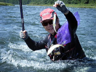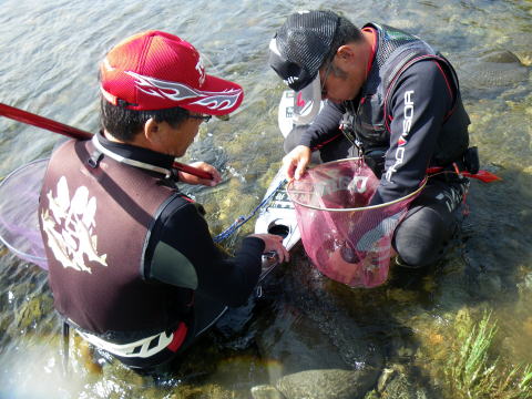 今年1回だけ日本に上陸した台風に邪魔され 中止を余儀なくされた我が戦隊の慰安旅行。 誰の行いが悪かったんでしょうね?(爆 この流れ去ったと思ってた慰安旅行。 隊員の熱い思いで急遽決行することとなりました。 行き先はもちろん 九頭竜川ヽ(゜▽、゜)ノ んじゃ行ってきま~~~す ε=ε=ε= ヾ(*~▽~)ノ ![]() っと、その前に (その前が長いのがこてつ流です) 平日(水曜日限定)が主な活動時間となる好条件戦隊。 通常の社会生活を送ってる方々には 参加したくても出来ない事が多いんですね。 こういう状況を 格式が高いと言います(爆 機関員としての見事な働きを魅せる@おまけ隊員も今回は断念。 急遽参加表明した関西激流隊総括隊長@マーシーも急遽断念(笑 そんな中何故か普通に行ける ピンク隊員とブラック隊員≧(´▽`)≦ 道楽者とはこういう人の事を言います≧(´▽`)≦ 結局、盛り上がった割には3名と言う こじんまりとした慰安旅行(*v.v)。 前夜には@シガノン隊員が宮川で納竿をするとか @レインボー隊員が北山一緒に行こうとか おいてけぼりの@おまけ隊員が寂しそうに店に来たりとか(笑 最終に向け、格隊員それぞれの思惑で活動してるのが伝わってきました。 九頭竜川はご存知の通り激流で有名です。 この川に精通したピンク隊員をナビにいざ出発ヽ(`д´;)/ あ・・・今回は大サービスで ピンクの自宅前までお出迎え。 ここまで私が運転して(20分)残りはブラック隊員が一人運転する事になりました。 ほんの 650キロめーとるぅ~~ ε=(>ε<) プッー! 有り余る体力を持て余してるブラック。 自ら男磨きの650キロを買って出た!! 助手席ではピーチクパーチクさえずる私。 後部座席では朝からワインで慰安旅行を満喫するピンク。 黙々と運転するブラック・・・・ あっというまに ![]() 九頭竜川の何処かに到着だ(*`Д´)ノ" どうやらここんとこの雨でやや増水中らしい・・・・ 上等や!かかってこい!九頭竜ヽ(`д´;)/ っとお調子者の私が言うかと思ったのですが ![]() 正直ちょっとビビってました(・∀・;)・・・・・ あちこちポイントを教えてもらって やってきたのは「板東島」 ![]() これは囮屋さんの駐車場前。 モタモタ着替えてようやく本日の攻撃目標へと向かったのは8時過ぎ(笑 ![]() 1本目の分流を恐る恐る首まで浸かって渡り 目に入った御漁場はとにかく広い広いヽ(゜▽、゜)ノ 体力温存派の私は、目の前で竿を出すことにしました。 ピンクとブラックはずっと上流まで歩いて行きました。 しかも豆粒位にしか見えない程遠くにいます・・・ ヤバイな・・・一番下流に立ってしもた。 流されたら誰にも気付いてもらえへんで((o(-゛-;) 一歩一歩足元を慎重に確認しながら ポイントを吟味します。 その私の腰からは ![]() 目一杯おめかしした激流舟が 本場の激流を満喫してました( ̄▽+ ̄*) 「鮎入れ専用激流舟」 囮を出す時 1匹飛び出させてしまった(・∀・;)・・・・・ まずい展開です(汗 残った1匹の囮で凌げるのか? とりあえず2号玉を付けて探りますが底を取れないので 即3号玉に交換。 入れてすぐ反応があるのですが 中々針に掛かってこない。 ようやく掛かった鮎は15センチ程の天然。 小さい。 再度養殖のまま入れると 反応があるが中々掛かってくれない。 ようやく掛かったのが先程と同じサイズ((o(-゛-;) 針のサイズを落として探ると サクッと掛かった同じサイズ(笑 鮎は居ても望むサイズの鮎はもう居ないのか? 釣り下り白波だった所でようやく20センチ級ヽ(゜▽、゜)ノ そしてわずかにサイズアップ数匹追加した所で もう1回元の場所に戻りました。 ピンクが上流から下って来てます。 ![]() しかしいつの間にか私の下へ(爆 どうもブラックは1匹目をバラシてリズムに乗れず苦戦。 ピンクも思った展開ではなく文句言ってました(笑 とにかく私の目標は 「自分の力で囮を1日回す」 なにしろ日頃の隊員教育が行き届いてますので 皆さん私の顔を見たら 「こてっちゃん、囮だいじょうぶ?(゜Д゜≡゜Д゜)?」 って聞くのが合言葉となっています(自慢! ピンクが下流に居るので安全が確保できて 何だか伸び伸びした気分になりました≧(´▽`)≦ 寒さで竿を置いたピンクを尻目に リーダーの貫禄を見せ付けたレッド隊長 キタ━━━━(゜∀゜)━━━━!!!!!! (まぁ、こういう事は自分の口から言うのも自慢臭くて嫌味やから ピンクの釣行記読んだってください(´▽`)デヘヘ~~) もう大満足の私(爆 しかし、ピンクの寒がり方が尋常ではないので 一緒に上がって早めのランチです♪ 当然、昼休みには関西激流隊総括隊長マーシー様から電話が来た。 増水で太刀打ち出来ないかと思ってたのが 昼までにツ抜け出来た旨を報告(*`Д´)ノ" あのね、例えば最初の写真 ![]() 三角の物体のチョイ上で 普通の仕掛けで釣ってたらソコソコ数も上がるでしょう。 でもね折角九頭竜や熊野まで来てるのにね 地元の河川で出来る釣りして数上げるより この川でしか出来ない釣りをする事に意義があると思いませんか? 撃沈したっていいんです。 ![]() 必死で踏