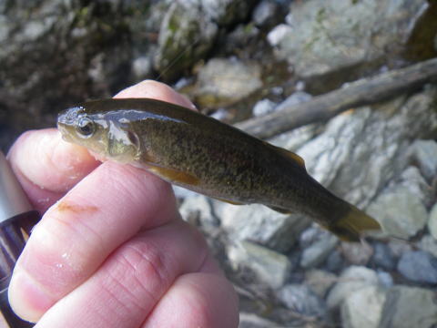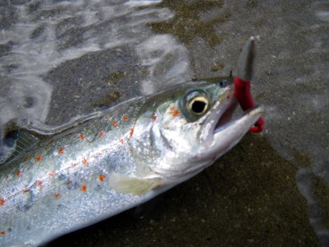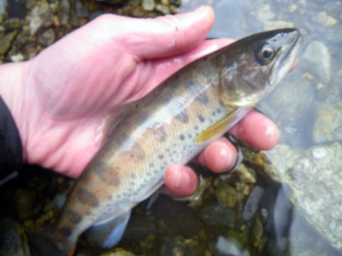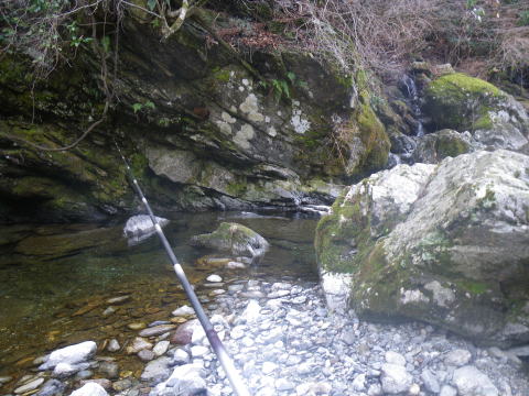 全国渓流ファンの皆様こんにちわ。 いよいよ待ちに待った渓流解禁と相成りましたね(*^-^*) あ・・・申し遅れました。 私、「こてつ」って言うチンケな男でございます。 以後お見知りおき下さいます様よろしくお願い申し上げますm(_ _)m いやぁ~~~ブログの方では アオリイカとかアジングとかの釣行記書いてたんですけど コッチHPで書くのはチョー久しぶりでしょ。 渓流解禁前夜より緊張して書いてます(笑 さて行ってきました。 私の渓流ライフと言えばもちろん「宮川上流」。 その宮川上流の情報屋 「宮川インフォ」さんからの流出によると どうやら解禁日には100匹以上、いやクーラー満タンの釣果があったとかw(°o°)w 私の中のアマゴ釣りのイメージはね 人気のない(ニンキでは無くヒトケ)山奥の渓を黙々と遡上し 見つけ出したポイントでそっと竿を振る。 そんな事を繰り返し、各ポイントで1~数匹。 小鳥の囀りに耳をかたむけオニギリをほおばる(*´∀`)ノ その日に家族が食べる分が釣れれば上出来。 そんなつつしまやかな釣り。 決して釣れないから 負け惜しみ言ってるんじゃないです(爆 鮎との決定的な違いは アマゴは年を越して生き伸びていく魚なんですね。 ちなみに鮎は1年で産卵を終え死んでいきます。 巨大化したアマゴを釣ったら、リリースされる方も多々いらっしゃいます。 そこらへんは個々人の考え方次第。 私は今年もとにかく 「楽しい釣り」 を目指して遊びまくっていきますよε=(>ε<) プッー! 午前9時 (遅いですか?) ![]() 覚悟はしてたものの行って見てビックリ。 この渇水具合はどうでしょう(;゜Д゜)! ここは! ってポイントを攻めてみるものの反応なし。 あ・・・今年も餌は「イクラの醤油漬け」を使用(笑 ニューアイテムとして ![]() 今回心に余裕があったら ちくわ(魚のすり身)も使ってみようかなと。 とにかくポイントを潰しながら歩いて歩いて 昨日解禁の今日ですし 天気も(一瞬)雪が散る程の冷え込み。 どうやらアマゴも怯えと冷え込みで隠れているのかな? それでも ![]() 上から木の枝が覆いかぶさってて 釣り難い場所とかでは ![]() 可愛い綺麗なアマゴが飛び出してきてくれましたヽ(゜▽、゜)ノ 普通の場所はもう釣り切られたのかな。 こういった小場ばかりでチョビチョビと釣り ![]() チクワでも普通に釣れたりしましたが やはり1回だけの使用で醤油イクラに変更。 他のアマゴ師さんもいらっしゃいますので もう動く場所も無く違う渓へと移動です。 おや?ブラック隊員からメールが入ってますね。 「釣れる?」 リアルでも無口で寡黙なブラック隊員なのだが メールでも無口だ(爆 訳あってブラック隊員、しばし竿を封印していたのだが アマゴから竿も出すとか言ってたから どうせ何処かで夢中になっているんだろう(* ̄Oノ ̄*) っとか思い、状況を返信すると 即返事が来た 「了解!オイラはコタツの中です(*^-^*)」 な・・・何ぃ~~~(*`Д´)ノ" コタツって何ね?あ? 即電話で呼び出し(笑 ブラック隊員が来るまで別の渓で ![]() ここはさっきの渓よりアマゴは濃い感じでしたが 反面小型が多い・・・・ 群が見えたのでしつこく攻めて ![]() こんなのが飛び出しガックリしたり 瓦礫に足を取られてコケて真剣涙目になったり それなりに楽しい時間が流れていきます。 数匹釣った所へブラック隊員も追いつき 目印無しで苦戦してた私に目印を持ってきてくれました♪ そんで目印装着もブラック隊員(*v.v)。 今年もこてつ流は健在でした(笑 ブラック隊員はルアー師。 今居る小場ではその腕をふるう事も出来ません。 そこで昨年発見した「管理釣り場風」ルアー師養成所へ移動。 ![]() 砂防下のプールです(笑 ![]() イキイキと久し振りに竿を振るブラック隊員@花粉症もどき(爆 追いすがってくるアマゴに興奮ε=(>ε<) プッー! ここではエサでは釣りになりませんので ブラック隊員に対抗し私が取り出したのは アジングせっとヽ(゜▽、゜)ノ アマゴもアジもメバルも、ひっくるめれば只の魚やろ? 昨夜使った(はい、昨夜も少しだけアジ釣ってました)竿を出し 負けじとワームで攻めます。 すると ![]() な?釣れたやろ≧(´▽`)≦ ↑↑↑ (この「な?」を今年も多用していきたいと思います) ミミズ色のワームが良さ気ですね。 ブラック隊員もルアーで今年の初物を上げ 昼過ぎに納めといたしました。 持ち帰りは12匹。 環境に優しい釣りをしてまいりました(* ̄Oノ ̄*) ![]() 痛いと思ってたら血出てました。(´д`lll) 河原歩きも気を付けて 今シーズンも安全に楽しく遊びましょう(^o^)/~~~ ■次週予告■ 本気のアマゴ釣りを魅せてあげようかな( ̄ー ̄)フッ |