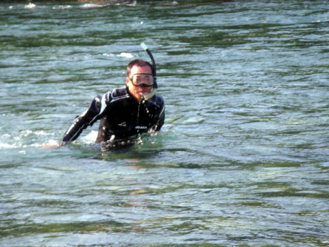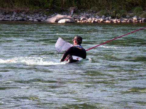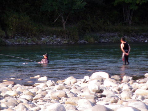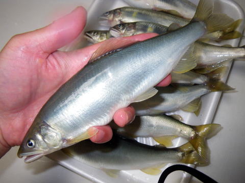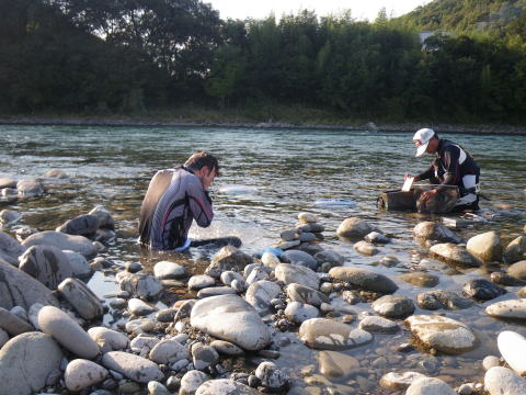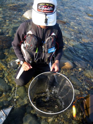 いったい何時終止符を打つべきなのか((o(-゛-;)・・・・ そんな往生際の悪い鮎師さんが 今年は多いんじゃぁないですか? 私もねんですけどね(^_^;) 攻撃範囲内のどこの河川も 浮いた話は聞こえてきません。 もうこのままコソッっと終わろうかな(・∀・;)・・・・・ そんな事を思ってた矢先、@おまけ君からメールが 「今週どちらか行かれるのならお供させてくださいヽ(`д´;)/」 まぁ何て元気なお子さんなんでしょ(* ̄Oノ ̄*) そんなキミの熱意に応え、急遽 金玉冷え冷えツアー開催決定(*´Д`)ハァハァ 行き先は長良川、いつもの場所を5時出発だ。 @おまけ君に加えブラックも追随。 行けない旨連絡してきたピンク隊員の声が寂しげだった└(´д`;;)へ=зムギュ~~ この3名のうち一人も長良川に精通した者は居ない。 羅針盤の無い木っ端船で航海に出るが如し! 案の定、早々に愛知県で道に迷うの巻(;・∀・) それでも何とか長良川にたどり着き 4匹1,000円という破格の囮を購入し 先に現地入りしてるこの方の待つ河原へと ![]() おはようございます。ボク@めろん♪隊員ですv(*^◇^*)v 只今売出し中の@めろん♪隊員。 好条件戦隊こてレンジャーにおいて最もメジャーに近い位置にいる男です(爆 朝の挨拶もそこそこに状況を聞くと 今一どころか全くパッとしないらしい。 ずらりと並んだ鮎師さんも石に腰掛けマッタリ釣ってました^^; とりあえず今日は子供用に子持ち鮎を釣らねばなりませんので 東海地方の全河川に精通してるdeibu君に電話してみます。 「長良川に来てるけど何処がエエん(゜Д゜≡゜Д゜)?」 「昨夜こてつさんのパソコンに地図とか送っておきましたよ(V^-°)」 う~~ん(-""-;) 昨日閉店直後から家出中の身(笑 パソコンのメールなんぞ見ているはずもなく deibu君のファインプレーも水の泡。(´д`lll) 口頭で再度情報を頂き迷い迷いやってきたのは ![]() こんな場所。 右岸が良いらしかったのですが ズラッとならんだ人数に圧倒され左岸で竿を出す事にしました。 時刻はまだ10時(爆 迷って迷ってたどり着いたのは 天国かそれとも地獄なのか。 やっぱり今日も ![]() @めろん♪鬼軍曹の厳しい指導の下 「囮の養生」に勤しむおまけ君(笑 モタモタと着替えた私は用意された引き舟を持って 川に入って行くだけで良い状態が整ってるって訳なのだ(* ̄Oノ ̄*) 今年も磨きに磨いた男道。 一回り大きくなってきたぞ( ̄▽+ ̄*) さぁ~~今日は子持ち鮎5匹がノルマだ! 張り切って行ってみようヽ(゜▽、゜)ノ ![]() 立ち込む姿も男前のなってきた@おまけくん。 今年も色々ありがとうね。 じゃ、冬場の男磨きに移行すっから楽しみにしてて( ̄ー ̄)フフフ ![]() 私も負けじと頑張ってみたものの 垢もまだ超うっすら付きかけで白ぽい川。 鮎からの反応が全くないまま時間だけが過ぎていきます。 右岸は一部垢が残ってる感じがありますが 10名ほど並ぶ鮎師さん、釣り上げたのは3回確認かな。 思った以上に渋くってね。 それでもナンダカンダで時合が来て入れ掛かると 高をくくっていたんですけど( ̄ー ̄)フフフ 時合全くなし_| ̄|○ いつもの様に見えなくなるまで遠くに行ってしまったブラック。 良い報告を持って帰ってくるかな? そんな渋い中でも数匹掛けた@めろん♪隊員。 ![]() 流芯・深トロ・そして鮎が跳ねたヘチと あらゆる場所に竿を差してました。 あまりの無反応に @おまけサブマリン号潜行命令発令だヮ(゜д゜)ォ! ![]() こてつ秘密アイテム「おまけサブマリン号」 竿や曳舟持ってなかったらどんな川でも切れる河童。 対岸にの鮎師さんのご迷惑にならない範囲で潜水調査です。 もう大半の鮎師さんは帰られてましたけどね( ̄_ ̄ i) ![]() 調査を終え「寒くなんかないもん( ゜∋゜)」 みたいな表情で上陸する@おまけサブマリン号(爆 鮎はそこそこ居たらしいです。トロ場に。 真っ白な鮎で浮き気味だったとか。 居ない訳では無かったんですね┐( ̄ヘ ̄)┌ ![]() 上流から帰ってきてまだ竿を出すブラック隊員。 底なしの体力を持て余してます(((( ;°Д°)))) それをこれまた「寒くなんかないもん( ゜∋゜)」 をアピールするかの如く、タンクトップで見学する@おまけ君(笑 午後2時を回った所で 1番のりでギブアップとさせて頂きました(*v.v)。 皆が上がってくるまで 河原を石で囲んでローマ風呂を制作。 ![]() 日が陰り始めた長良川で 今年のアカを綺麗サッパリ洗い流してきました≧(´▽`)≦ え?釣果ですか? @おまけ隊員 0匹 ブラック隊員 2匹掛けて2匹埋め込み0匹 めろん♪隊員 数匹ゲット! 全く不甲斐無い隊員共ですね。 なぜか毎回入れ掛かる私、レッド隊長の釣果 バーディー(爆 ワンアンダーとも言いますね(T_T) いやぁ~~朝ね、4匹1000円の囮を見て 「3人で4匹でエエんとちゃう?普通?(゜Д゜≡゜Д゜)?」 って言い放ってた自分がカッコ良すぎでちゅ(*v.v)。 ![]() 今日の残った鮎をタモにまとめてみました。 大漁みたいですが囮が4人で12匹スタートですから この鮎はほぼ囮だらけって事になりますね(笑 免停で始まり台風で途切れてしまった2011夏の陣。 と