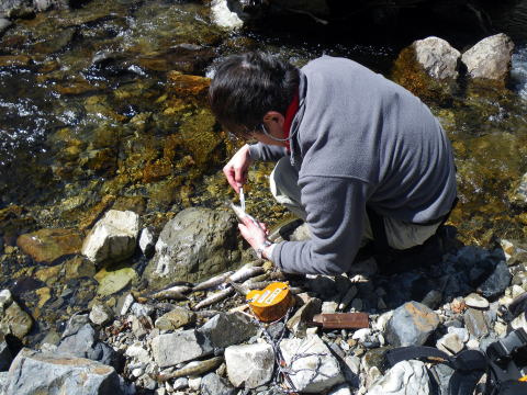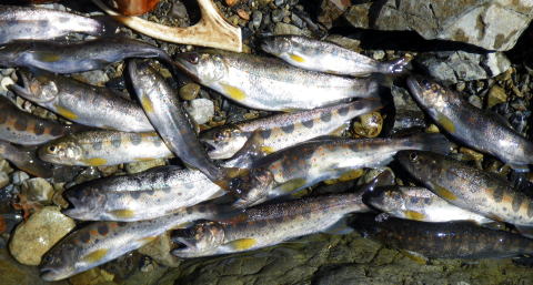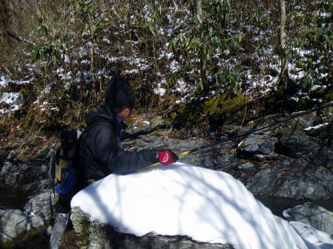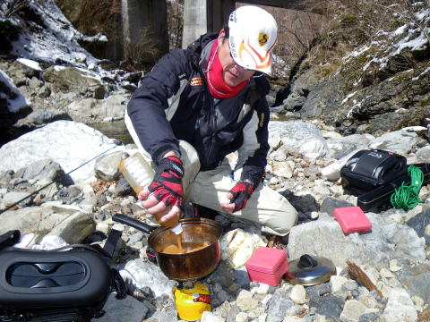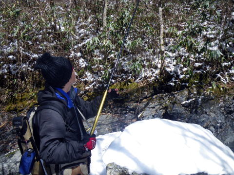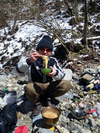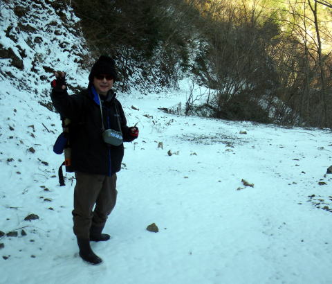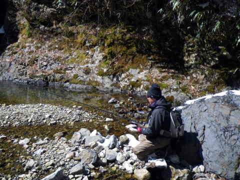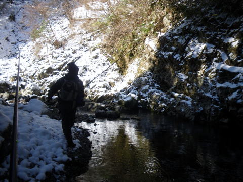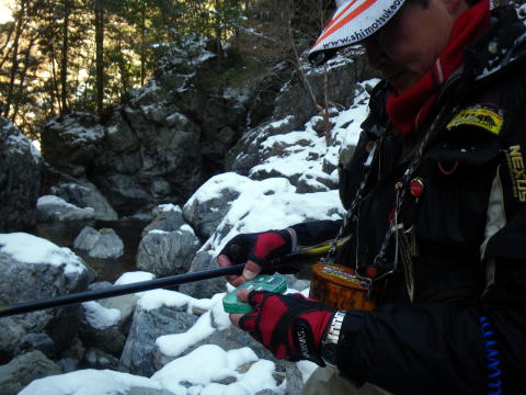 皆様ご無沙汰しておりますぅ~~Σ(゚∀゚ノ)ノキャー久しぶりぃ~ 今年もいよいよ川遊びの出来る季節になりましたね。 え?渓流の解禁は3月1日なのに 今まで何してたのって?? だってほらぁ~、1日は木曜日だったでしょ。 まる1週間経ってから川入ったって普通の釣りになるでしょ。 だったら1週間も2週間も同じかなと思ってね。 ほんで先週は海に行って遊んでたらさぁ~~ ![]() こんなモンスター釣り上げちゃってさ(;゚∀゚)=3ムッハー 夜は夜で ![]() アジングで何かと釣れる様になっちゃてね(ΦωΦ)フフフ… もう川だけの男じゃなくなっちゃったの(爆 でもやっぱ川が好き♡ 2月初旬から既に 「不思議の国のヒデ」隊員から渓へのお誘いを受けてたんで 今日を私の渓流解禁日って決めてたんです。 「体ひとつで来て下さいヽ( ´ー)ノ フッ」 そんなありがたいお言葉に従い 丸腰で出かけた先は ![]() 多分ココらへんだと思うのね(笑 もうちょっとで奈良県? 行ける所まで車で行って後は徒歩。 車を停めた場所の外気温はマイナス4℃。 寒いってより顔が痛かったです(爆 ![]() 雪道を黙々と歩く二人。 ![]() 岩清水がツララとなって垂れ下がり 目を楽しませてくれました♪ 1時間歩いた所で小休止 ![]() 豪華モーニングを用意してくれるヒデくん。私の分もだ! 何せ私は言いつけ通り「体ひとつで」来てますので な~~~んも持ってませんww ここらへんの詳しい経過は 「ラーメン屋のオッサンBlog麺’sこてつ@非売品」をご覧下さいませ 歩くこと3時間弱。 ようやく川原に降り立った二人 ![]() 私言いつけを守って手ぶらです。 竿も仕掛けもエサも何もかもヒデ君が準備してくれてますので ここで釣具一式をセットしてもらい受け取ります( ̄ー ̄)ニヤリ さぁ~源流の釣りを満喫するぞ(;゚∀゚)=3ムッハー ![]() 私が釣り上がる後ろから付いてくるhideくん。 もちろんカメラマンとアドバイザーを兼ねている。 私は釣ってるだけヽ( ´ー)ノ フッ ![]() チョッピリ小ぶりの今年の初物です^^ 出発地点の気温がマイナス4℃。 ここはもっと標高が高いですから川原一面が氷の世界。 ツルツル滑って危険が危ない(゚∀゚)アヒャ とかダジャレ言う余裕もない程 足元が凍りついてて怖かったです。 何せコケたら下は岩ですから痛いだけじゃ済みそうにないです。 魚影は濃いものの食いは渋い。 当たりが出てもその場を動かない目印。 エサ咥えてジット何かを妄想してるのでしょうか? かなり我慢して待って合わせてもポロポロ落としてしまいます。 それでも ![]() エエ型も飛び出したりで大はしゃぎのこてつくんw 後ろから付いて写真を取り続けながらも ![]() たまに竿を振って的確に獲物を捉えていくhideくん。 普段は只の変態でも川に入ったら惚れてしまいますよΣ(゚∀゚ノ)ノキャー 言われた尺ポイントに投入すると 明らかに大物が掛かったんですけど 途中でバレてしまったりもしましたが 「もっと大きくなって楽しませてくれたらいいや」みたいな おおらかな気分にさせてくれるのも渓流の魅力ですね。 ![]() 岩の後ろに身を隠し攻めるこてつ(ΦωΦ)フフフ… ![]() しかし上の木に引っ掛けてパー(爆 ほんと何度木に引っ掛けた事か・・・・ でもご安心♪ 嫌な顔ひとつせずに外しに来てくれるhideくん。 切れてももちろん迅速にリペアしてくれます。 ![]() 正に釣ってるだけの御殿様@こてつ(`・∀・´)エッヘン!! ![]() 草木も凍りつく寒さの中で 熱く燃え上がる釣り師2名。 そして接待釣りの見せ場ランチタイムには ![]() なにやら妙な液体を準備してきたhideくんヮ(゚д゚)ォ! 手際よく準備されたのは ![]() 味噌仕立ての「猪鍋」 イノシシのお鍋です( ゚Д゚)ウヒョー 食事中も ![]() マメに火力を調節し最高のおもてしをしてくれるhideくん。 シメはうどんを入れてくれて ![]() 喰らうだけ喰って暑くなって上着脱いじゃってる私(笑 欲を言えば一杯やりたかったのですが 帰り道も数時間歩かないといけないでしょ? やっぱ遊びに来てて怪我してちゃぁ遊び人の風上にも立てません。 もう大満足の大満腹 ヽ(*´∀`)ノ キャッホーイ!! もう動く気が無くなってるのを察知したのか ![]() 獲物を割いて綺麗に掃除し始めるhideくん。 何から何まで人任せで、私はただ釣るだけ(笑 ![]() 家族で食べるには十分です。 沢山釣ろうとかって気持ちがそんなに無くなるのが不思議ですね。 大自然の恵みをチョット分けてもらうって感じになってしまいます。 綺麗な天然のアマゴが釣れる環境。 いつまでも残ってると良いですね♪ 歩いた時間の半分も釣りをしてませんが お昼にて納となりました。 帰り道、hideくんが指さす方を見ると ![]() 見つめてました(笑 ジット私を見てますので ![]() 近くに寄ってって記念撮影(爆 それでも逃げないカモシカくん。 もしかして人間見るの始めてなんか?? ![]() あ~~今年も何だかんだで楽しくなりそうですね♪ 鮎までの間、海と川を掛け持ちしてやっていきますので たまに覗きに来て下さいませヽ(^。^)ノ って事で、2012年も宜しくお願いします! |