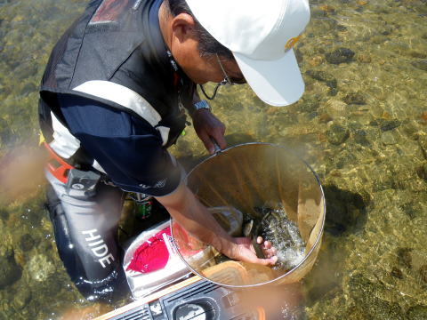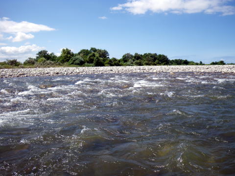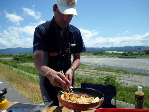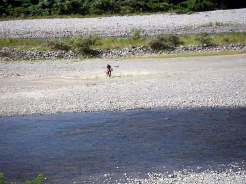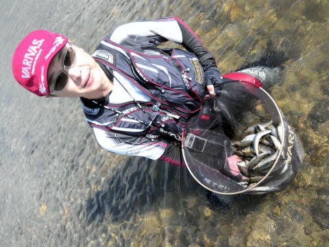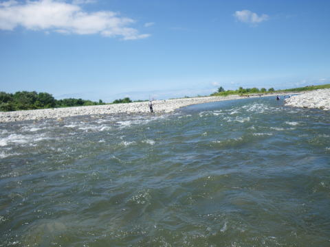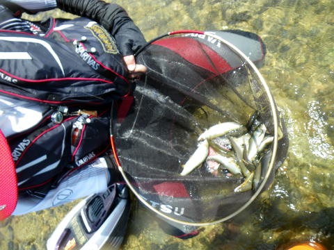今週のお休みからお盆営業に入ります。 22日の水曜日まで無休です。 表向きには 頑張って美味しいい物作ってるからミンナ来てね(^^♪ みたいな商人モードですが この暑い時期、尋常でない量の中華そばを作るとなりますと それなりの覚悟と忍耐力が必要になります。 何か溜まってくるモンも尋常ではございません(爆 では今週こそ、身も心もスッキリ浄化して お盆営業に備えようじゃぁありませんか(・∀・) この絶対にストレスを溜め込む事は許されない釣行には やはりこの方に登場して頂くしかなさそうですね( ̄ー ̄)ニヤリ いでよ!好条件戦隊こてレンジャー1の変人! 「不思議の国のhide隊員」降臨! キタ━━━━(゜∀゜)━━━━ッ!! その秀悦したアブノーマルっぷり。 卓越した釣り技術。 通常ですと私の様な常人とは相容れない別世界の住人。 しかし、その心のこもった接待ぶりは天下一( ゜Д゜)ウヒョー 「隊長!私、不思議の国のhideが御接待申し上げますm(__)m」 アマゴ釣りの時は過去に伝説の接待釣りを何度もしてくれてますが 鮎での同行はあっても接待釣りは初めて。 期待に胸を膨らませ待ち合わせ場所で寝て待ちます(笑 ぶっちゃけ、どこ行くのか良くわかってません(;・∀・) 私はただ、お迎えの車の助手席に乗り込み そこに用意された朝食を食べ デザートにこれまた用意されたビールを早朝から飲み そしてうたた寝(つ∀-)オヤスミー 車の揺れで目が覚めたら なんとなく一言二言どうでも良い事しゃべって またうたた寝(つ∀-)オヤスミー 目的地へ黙々と車を走らせるhideくん。 (ここからhideくんって表記します) さすがの私も川が見え始めると どことなくソワソワし始めお目目もパッチリ。 囮を買いに囮屋さんに到着。 ![]() いやぁ~私も色んな囮屋さんにお世話になってきましたが こんなにワクワク感を盛り上げてくれる囮屋さんは始めてです( ゜Д゜)ウヒョー 囮屋さんが趣味で遊園地をやってるのか 遊園地が趣味で囮屋さんをやってるのか(・・? その正体は北陸最大級のレジャーランド <手取フィッシュランド>でした。 どうも釣り堀から事業を興し、ペットショップ 遊園地へと成長していったみたいです。 園内には乗り物各種有ります。 そして釣り堀も。 そこに囮の水槽があって販売してくれてます。 ただ、普通の日はAM9:00~の販売です。 お盆とか日曜日とかは早くから遊園地もオープンするので 囮販売も早くからみたいですので各自確認する事! ![]() これが今日のターゲット「手取川」 中央右にさっきの観覧車が見えてますね。 手前が分流で中洲向こうが本線。 もたもた着替えをしてる私を尻目に ![]() 囮缶担いでさっさと川原に向かうhideくん。 決して私をほったらかした訳ではありません。 第一に「囮の養生」 そして、何だか人が多かったので場所の確保。 私の身支度を待ってたら囮が缶の中で浮いてきます(爆 状況は、一昨日夕立か何かで濁りが出て昨日は白濁。 今日は濁りも取れた様ですが本線は泥かぶって色は今一。 今一って言うより、釣れるんやろか?と不安がよぎりました。 水温も低め、それに加え爆風と不安材料目白押し ( ;´Д`)いやぁぁぁぁぁー! 瀬と瀬の間のトロ場?タンクみたいな場所に 地元の方っぽい4人組が陣取ってます。 一声かけて一番下の瀬肩に入らせてもらいました。 hideくんは上の瀬の流れ込みへ。 ![]() 支度をしてる間に上のトロ場でおじさんが掛けました。 海産100%のこの河川。 天然遡上物にありがちなやや小ぶりの鮎が見えましたので 仕掛けはハイブリッドメタマックス004、針は6.5号3本でスタートです。 ちなみにこの場所、鑑札が要りません。 でもネットで見たら手取川でも上流?は鑑札が要りますので そこらへんお間違えの無い様にして下さいね。 開始早々 ガガッ☆彡 海産特有の一発追いで掛かってきました。 そして一瞬で目印を見失うこてつくん(@_@) ぶっちゃけ、サイズ的になめてたんですけど んなもん、掛ったら目印ぶっ飛んで何処行ったか分かりません。 ほんで爆風は川上からですので竿立てるのも一苦労。 しかも立ってるのは瀬肩。 瀬に落ち込んだら仕掛けが切れる可能性も大。 入ってる石も頭大でそんなに機敏に動ける状態でもない。 でもしっかり埋まってるので足を取られることも少ない。 ようやく囮が浮いて抜きに掛かると そこからまた水中へと突っ込む野アユのパワーが凄いのなんの! 爆風も手伝って久しぶりに 手首がペコリンコ_| ̄|○ 再度両手で竿を持ち直し 抜きに掛かると、水を切った途端ビヨ~~ンってぶっ飛び 案の定キャッチミス(笑 後ろに飛んだ鮎がまた猛ダッシュ! どんだけパワーあるんね( ゜皿゜)キーッ!! 何とかすくったのはマズマズのサイズ。 1匹釣るのにこんなにジタバタしたのは久しぶりε=(>ε<) プッー! 数匹釣った所で針を4本に。 そこから蹴られるバレルの連続で数が伸びません。 様子を見に来たhideくんにアドバイスをもらって 大きめの針にチェンジ。 ![]() 当たり前ですが順調に掛けるhideくん。 囮も余裕になった所