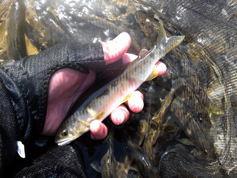 どうもぉ~~皆さんお久しぶりでございます。 伝説の鮎師@こてつでございます(゜ 0 ゜)┘ 5月26日がホームの宮川の解禁だったんだけど 土曜日だったんで行けないでしょ。 だから次の水曜日に解禁予定だったんですけどね 確か昨年は第2週の土曜日か何かが解禁だったよな(・・? そんでもって今年は26日の土曜日が解禁。 って事は来年も土曜日に解禁するのかな? 日付固定の解禁だと7年に一度は解禁日に竿を出せます。 しかし、土日解禁にしてしまうと ホームの解禁日に一生参加できへん(;´Д`) コレは由々しき問題ですよ!私だけですけど(笑 チョッピリもやもや~~って思いが込みあげたこてつ君。 そんで迎えた解禁日26日 目も当てられぬ貧果続出( ゜д゜)ウッウー 今更書くまでもありませんが昨年の台風の爪痕が残る宮川。 釣り場がグッと減って工事で濁りも出る始末。 鮎の生育状況も確認できない中での解禁日撃沈。 でもご安心。 自前の養魚場を持つ宮川上流。 解禁後4日目に追加放流だいΣ(゜∀゜ノ)ノキャー しかも800キロΣ(゜∀゜ノ)ノキャー その日は正に私の解禁日。 追加放流したばっかの鮎はスーパーに売ってるのと同じ。 宮川の鮎に変身するには1週間は必要かな(ΦωΦ)フフフ… もやぁ~~ってした思いと 綺麗な鮎を釣る為に1週間自主的に解禁延期( ̄ー ̄)ニヤリ っとここまではほぼ想定範囲内だったんですわ。 30日 @おまけ隊員から宮川釣果報告が 38匹釣れましたぁ~~ヽ(゜∀。)ノウェ まぁ真っ黒の放流群れ鮎やろ・・・ @おまけ君も上手くなったじゃぁないか'`,、('∀`) '`,、 とかタカを括ってたんですわ。 翌31日 @ブラック隊員から宮川釣果報告が 53匹!瀬で黄色いのが追って来ました(*゜∀゜) し・・・しまったぁ~┌(>0<)┐ どうやら追加放流で刺激を受けた最初の鮎が ビックリして出てきちゃったみたいか? それから毎日届く尋常でない釣果。 居ても立ってもいられないと同時に ヒシヒシと忍び寄るプレッシャー(爆 こんなに釣れてたら流石に鮎減ってきたやろな。 俺行く頃には釣り切ってビリ鮎ばっか残ってるだけちゃうか? まだ釣れる鮎残ってるんやろか《(;>_<;)》 そんな気持ちで迎えた6月6日。 こてつ君だけの解禁日。 ちなみにピンク隊員は大内山川へ。 珍しく前夜は誰からもメールもなく一人宮川へ。 まずは「大原友鮎販売店」の宮川インフォさんにご挨拶。 何だか寝坊して遅れて出勤してきた新人みたいなw 状況を聞くと 「ダムの水抜いたし、急に冷えたし、 昨日の昼から何かヤバイで; ~~~ ; 」 このダムの水が曲者でね。 コレを機に鮎がピクピクしたりするんです。 「んじゃぁ、ノルマは20匹でいい(・・?」 「こてっちゃん、ツ抜けもヤバイかもしれんで( ̄へ ̄)ゞポリポリ」 何か状況が変わったみたいですね^^; とりあえす「いたどり」へ ![]() 午前6時。一番乗りです。 川は渇水。ここは石がビッシリ入ってますが ねぶってピカピカって感じは今一感じられない。 あ・・・今日はデジカメ忘れたんで携帯で撮影してるんだけど なんかね5時間で充電切れて、充電するのに5時間かかるの(笑 だから、撮影以外は電源切っての携帯撮影なのね。 そりあえず、開始早々1匹目・・・2匹目・・・3匹目 15センチ程の鮎が背掛かりで釣れてきます。 まだ誰も居ませんので一気に大熊出会いまで 1場所2分程度でポンポンっと探って下ります。 ココは道が見えてますので誰か来たら 良さそうな場所に陣取るつもりでの斥候です。 ものの半時間でツ抜け(゜∀゜)キタコレ!! でもね、下に行くとノリが生えてて嫌だったし 道に後続の鮎師さんも来ましたので 一番良さそうな最初の場所へ戻りました。 順調に掛かります。 っとそこへ爺様がカンコガチャガチャ言わせながら登場。 んで 「ワシ今日はココやろうと思ってきたのに兄ちゃんおるで出来やん(¬_¬)」 とか仰られる訳ですわ(> <;)☆☆ 聞けばココに通い続けて狙ってたらしい。 そこそこ釣ったし爺様に場所を明け渡し放浪の旅へ・・・ 荒瀬まで見に行ってきました。 鏡の様なトロ場で跳ねる群れ鮎。 いつもの荒瀬の一番下は泥被り。でも鮎は居ます。 ![]() っとそこへ@ブラック隊員が登場。 対岸から撮影してくれましたm(⌒▽ ⌒)m さっきの「いたどり」に入るとか言ってたんで 私もココを見切って戻ります。 が、途中気になった場所でやったら やっぱ19センチ程の鮎が追ってきて掛かります。 午後からに残してブラックの所へ ![]() 普通は最後に撮影するのでしょうけど 今日はほら、電池が切れそうなんで雰囲気だけ撮影(笑 ランチ後はさっきの場所へ直行。 ![]() 漁協の監視員さんが撮ってくれてたみたいです♪ まぁ見られてる時にキャッチミスしましたけどね;(´o`); 2時頃かな バイヤー武ちゃんもやってきてね さっきから気になってた小さなポイントに迷わず入って入れ掛かり(◎◇◎) ![]() そんでコッチに聞こえるか聞こえないか位の声で 「あ・・・また掛った!(・◇・)!」 「こりゃかなん!入れ掛かりや(XoX)」 とか呪文の如くつぶやくんですわ。 絶対俺に聞かせてるん