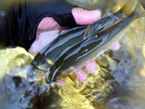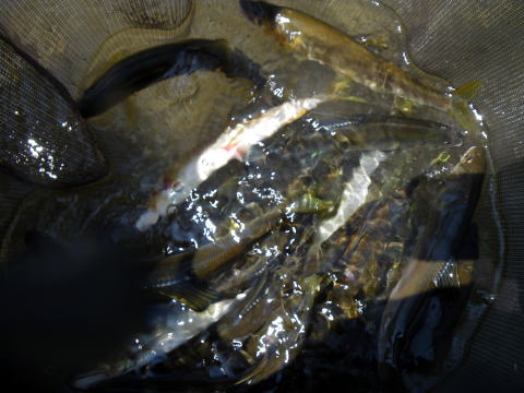 (´Д`)ハァ… もう釣れないわ渇水だわ 好条件戦隊的には最悪ですわい。 今週はもう止めとこかな・・・ でも8月は休みが3回しかないし、うち1回は家族サービスやろ・・ ちゅー事は、2回しか竿出せやんのやでヽ(´Д`;)ノアゥア… どうせ昼にはホゲて上がるんやったら いっその事、南下して古座まで行ったろか? でも夜は夏祭りのキャラクター山車完成パーティーあるし ![]() 出来たでヽ(°▽、°)ノエヘヘヘヘ ほんならやっぱ地元か・・・ 聞けば大内山川は網も入って 数人で1200採ったとかw @おまけ隊員も数百匹を一網打尽! やっぱ鮎はイッパイ居たんですよね。 掛けれないのは腕やろ? んじゃぁ、まだ引っ掛けしか解禁になってない 宮川に行くのが有利ちゃぁ有利だわな。 風の噂では、エエのん釣れてるらしいしね。 ってな訳で今週は迷った挙句 宮川でマッタリ遊ぶことに。 いつもの様に 宮川インフォさん(大原友鮎販売店)で朝のおしゃべり(笑 今年はここらは雨が降らない渇水ですが 愛知岐阜~北陸方面は大増水。 そのせいで、他府県ナンバーの車が多いです。 私が囮買ってる間にも他県ナンバーが! で、何処に入るかも迷ってたんですが 結局釣果が安定してる「荒瀬」へ ![]() 上の棚が本命なんですが人が居たし 瀬の開きはイマイチ曇ってる感じだし 深トロを選択 そうこうするうちに ![]() 左岸側には5名ほどの人が陣取り あまり近くに行くと川幅もないので邪魔かなと 同じ場所を行ったり来たり(笑 久しぶりに ![]() @おまけ隊員も追っかけてきて 日焼け止めを塗り塗りして 何かをアピールしてましたが無視(爆 この時点(9時過ぎ)で1尾_| ̄|○ @おまけ隊員は上の棚で 私は再度同じ場所を行ったり来たり(笑 やっぱ時合ってあるんでしょうね。 さっきは何も反応なかったのに ポツポツ掛かりだしてね 挙げ句の果てには ![]() アベレージサイズが下ので 二回り大きいのんが大暴れですわ(;゚∀゚)=3ハァハァ ![]() 囮も余裕あったんで 瀬もガンガンやってみましたが この日は反応が悪く、サイズも小さ目。 芳しくない@おまけ隊員に 囮を分けてあげる余裕すらあったりして こんな釣り久々ε=(>ε<) プッー! 下流域に旅に出た@おまけ隊員。 対して私は同じ場所を行ったり来たり(笑 鮎が大きくなってるせいか 掛けた鮎のウチ2匹が鼻環付いてました^^; 親子丼注意の季節になって来たんですね。 私はトロ場って事で ラインはVARIVASハイブリッドメタマックス004でやり取り。 ラインブレイクしてくれると限界点が分かるのですが まだまだ大丈夫な感じで、限界がつかめるまで004で行くかな。 そうこうするうちに @おまけ隊員が上がってきてもう帰るとか。 下で少しエエ思いも出来てプチ満足? 「隊長!鮎置いてきますね(^^)」 お!これは有難い。 今日のノルマはお使い用良型20尾だったんで足しになります。 一方私はノルマ達成だけはしておこうと 同じ場所を行ったり来たり(笑 朝は曇ってた瀬の開きも 何だか芯が良い色になってきてて しっかり追ってくるから不思議ですよね(^^) 友釣りは循環の釣り。 囮も余裕なんですが水温が高く 舟の中で酸欠?で変色が始まって来ましたので 何せお使い用、見た目が重要w ![]() 腹見せる前にクーラーに入れれば良いのでしょうが 河原横付けポイントならともかく 実際面倒臭がって変色させてしまいます。 1時過ぎで終了。 22尾でノルマ達成(^O^) その場で氷で〆て 家帰って箱詰めしてそのままお届けしてきました。 んで、 夜の山車の打ち上げで ![]() 冷凍してあった鮎とアオリイカを 皆に食べてもらいましたо(ж>▽<)y ☆ 武勇伝に尾ひれ付けてぶっこくはずが マメに動いててそんなヒマなかったです(ノ∀`)アチャー いやぁ~~釣りって楽しいですね♪ ちょっぴり盛り上がってきたけど お盆恒例2週連続営業&家族大サービスで しばらく川はお預けなんだな・・・コレが(^^ゞ |
