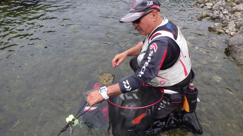 皆さま、こんにちわ~ 今年の夏は日焼けしようと思いましてね SPF50+++の日焼け止めから コパトーンのサンオイルに変えたこてつです(^^)/ だってほら見て ![]() 皆で写真撮った時 いつも私だけ青白い顔してるから(笑 せめて健康的程度に焼こうかなと(^^ゞ さて今週は我がホーム河川 三重県宮川上流へと行ってきました 何だかんだで大内山川に居るのが多いメンバーですが 私自身は宮川上流漁協の組合員 友釣り始めた思い入れのある河川なんです 今週のお供は 今期ノリノリのはっちゃんと メキメキと実力を付けてる@おまけくん なんですが 聞こえてくる情報が・・(´ε`;)ウーン… 両名からお供の申し入れがあった時も 「僕は宮川行くから、無理して来なくていいよ~(^^ゞ」 「雨降るみたいだから、止めるならソレでいいからねぇ~(^^ゞ」 っと、万一の事態に備えて やんわりお断りしやすい状況を作ってあげたのですが 「どこまでも隊長に着いて行きます(`・ω・´)シャキーン」 「それが男道ヽ(`Д´#)ノ ムキー!!」 こっちの気持ちを察するどころか 隊長御一人で危ない橋を渡らせる訳にはいかんぞ(-_-メ) っと逆に闘争心に火が付いた模様(笑 ![]() 毎度お馴染み宮川インフォ(大原友鮎販売店)さんに新年のご挨拶(^^) だらだらと世間話しながらも もちろん直近の情報を聞くわけですが その会話でポロッと 「今年は何でか地蔵が良く釣れとる気がするなぁ~(´ε` )ボソッ」 こてつくんのアンテナがピクンと反応しましたわ(ΦωΦ)フフフ… いえね、朝一の作戦では 超渇水って事でしたので数本の谷が合流する 下流域でって思ってたんです 急遽段取りを変更しまして 「はっちゃん!地蔵や!行くぞ(^^)/」 っとやってきたのは お地蔵さんが目印の ![]() か・・・かまのくち(・・? いやぁ~長年宮川に通ってましたが 僕的にはココは地蔵だと思ってた訳で(^^ゞ 100メートルも離れず下流に「地蔵」があるんですが 僕の中ではここは「地蔵の上んトコ」なのw 河原歩いてでも「地蔵」は行けますので とりあえずココに入川しました ![]() 囮の養生に勤しむはっちゃん 「朝は渋いらしいから、囮は1匹でエエわ」 「ちょっとやってみてヤバかったら即移動って事や!」 「はい!隊長(`・ω・´)ゞ」 新品残しとけば 後の展開も楽でしょ(^_^;) 午前中坊主なんて話も聞いてたし・・・ あっ(;O;) 「隊長!囮1匹飛ばしてしまいました(;・∀・)」 何ワイを追い込んどんねキミは(*´Д`)ハァハァ ![]() 飛ばしてしまったモンは仕方ない はっちゃんは「かまのくち」で 私は「地蔵」まで下りました 聞いてたほど渇水って気もしないし 水もスイスイで綺麗なもんです♪ ヘチはアレですが 騒ぐ程もんでもないやろ(o ̄ー ̄o) お!ぎょーさん鮎も見えてるがな! ここ宮川上流漁協は自前の種苗センターを持ってますので 自分の川で獲った鮎から採卵し 自分の川の水で育てて放流してます そんな関係でその放流量密度は 日本一と言っても過言ではないかと思います ![]() 開始程なくまっ黄色の鮎が来てくれてε-(´∀`*)ホッ その後もポツポツト掛かり 万一の事態は回避で一安心♪ ![]() 徐々に釣り上がりながら 色んなポイントの反応をみていきます ![]() 追っ付けやってきた@おまけ隊員も 岩に隠れて渋い攻めを魅せてました(^-^) ![]() はっちゃんも1ヶ所にとどまり 余裕のVサインをしてるとこを見ると 順調に釣ってるのかな(^^♪ 今年からマイカメラ持参で 私のパパラッチをしてくれる@おまけ隊員 ほんじゃぁ今日もいっときますか(≧◇≦) ![]() ほんならここら辺泳がせてみるよ~~(^ム^) はい隊長!今日もカッコいいです(≧◇≦) ![]() ほれ!掛かったじょ~~ 抜いてエエ?もうエエんか? はい!大丈夫です(`・ω・´)シャキーン ![]() 鮎ぴよ~~~ん<゜)))彡 だから連写は出来やんのか"(-""-)"ブツブツ そんでも段々と写真も上手くなってきてるやん♪ 九頭竜に向けて引き続き精進する様に♡ ![]() 早目のランチに入っても カメラを手放さない@おまけ隊員(爆 この時点でみんな20匹超えてたんで 事前情報でビビってたのがウソの様www ![]() 午後からも午前と同じポイントで 粘る粘るはっちゃんの今期は見事! ![]() この時期にこのサイズってなんね(嬉! ![]() 昔は@おまけ隊員より沢山釣って当たり前だったけど 今は囮の面倒まで見てもらう様になりました(笑 私が下手になったんじゃァなく @おまけ隊員が上手くなったって事なんですね(^-^) 私の元で男磨きしてきた結果ですw ![]() 帰りには宮川インフォさんに釣果報告 はっちゃんが撮影用に活かして持ってきてました こういう気配りの出来る子に 私が育てました!私がッwww ![]() 渋い渋い事前情報は何だったんでしょうね(・・? それぞれ35~40匹位の釣果で 3人共に大満足の1日でした(^^)v ![]() 光り輝け! FISHING SOLDIER 好条件戦隊JAPAN☆彡 試作品のホログラムステッカーが 思ったより見えにくくて内心凹んだこてつでした(-_-;) ![]() 普通にコレが分かりやすいかな(´・ω・`)ショボーン |