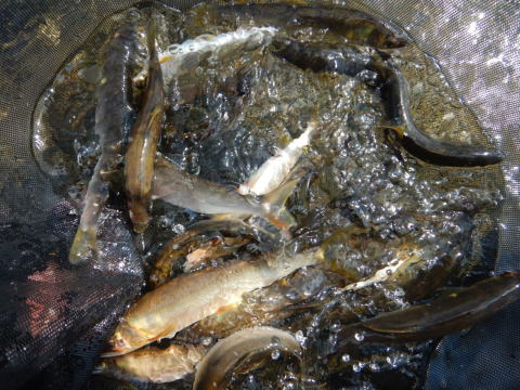 蔓延防止とかなんとかも緩和され 通常営業モードに突入するものの もともと8時まで営業の店ですので何ら変わりも無い ラーメン屋のおっさん@こてつです('◇')ゞ 昨年のGWに出された緊急事態宣言下では かなりピリピリした雰囲気が漂ってましたが 今回のは特に人の流れも変わる事が無かった気がします コロナに対する構え方は人それぞれでしょうけど 私と私の近い友人は とりあえず県外遠征とかは辞めといた方がいいねって事で アオリイカのデッカの狙いにお隣の県にも行かず でも地元で楽しめますから とっても恵まれた環境なんですけどね さて今週は何処に行こうかなと思いを巡らせ 地元河川が元気になるにはあと少し掛かりそうだし 湖産鮎が元気してるみたいなのでソッチか? 蔓延防止も緩和されたことだし っと、皆さんの釣行記を読みながら 「安曇川」「愛知川」なんかを検索φ(..)メモメモ 安曇川は一人で行くには遠いけど 愛知川なら行けそうだな(((uдu*)ゥンゥン お!ちょっと足伸ばしたら多賀SAがあるやん! ここには皆が喜ぶお土産があるんだよなぁ~(^ー^* )フフ♪ とか思いを巡らせ道具を積み込み 愛知川ロックオン(`・ω・´)ゞ そこへピンク隊員からホットライン 一か八かになるけど野洲川どうかな( ̄ー ̄)ニヤリ 思うことは皆同じだったのかな? ピンク隊員も湖産鮎に食指を動かしていたんですねw 私が一人で愛知川に行く事を思えば 一か八か所か大船に乗った釣行 しかもその地域に詳しい気まぐれ翁隊員のナビ (ノ・ω・)ノオオオォォォ- 行く前から 勝利宣言(^^)v と思いきや皆さんご存知の通り 野洲川漁協は解散しましたので放流は無し しかも無法地帯?ですからガリでも網でも何でもアリアリ 友釣り師にとっては網が入ってたら即アウトの状況 ゆえに一か八かって事だったんですね ちなみに野洲川上流域には漁協がありますので こちらはルールもありますし鑑札も必要です ![]() 川原横づけポイントを好む気まぐれ翁隊員のナビでやってきたのは 正に横づけポイントでした((笑) ![]() 実は大昔にココ野洲川に来たことがありまして あんまり良い印象は無かったんですが この日の川を見る限りあの日とは別物 ![]() ナビは気まぐれ翁隊員 ドライバーは私 囮の養生はピンク隊員w 3人それぞれのポイントに散って釣り開始 私は瀬肩っぽいとこで ギュン☆彡 いきなり激しい当たりからの強烈な引き(;゚∀゚)=3ハァハァ 中々抜けずこりゃぁ大物!? っと抜けて飛んできたのは1匹(・・? ![]() どうも囮は鼻がハズレて飛んでったみたいで(^^; ちょっぴりテンションダウン(´・ω・`)ショボーン ![]() ピンク隊員も珍しいスタイルで釣ってます ポツポツ掛けるも細かくて苦笑い 時にナマズ?ニゴイ?も掛かり 仕掛けロストでこれまたテンションダウン_| ̄|○ ![]() こういうポイントは得意なのか 気まぐれ翁隊員は順調に数を伸ばしてる模様 私もポツリポツリ・・・ でも引きが当たりと引きが強烈でコレはこれで楽しい♪ ピンク隊員はずっと見えない所まで旅に出て 私は飽きてきた所でベースキャンプに戻りランチの準備 そこにピンク隊員からホットライン 「コッチがエエから、車コッチまで持っておいで(。-`ω-)」 なぜかひそひそ声で話す状況にいつもと違う何かを感じ取り 囮缶も何もかも積み込みなおしてソコまで移動 ![]() 鮎釣りにおいて人の居る所は鮎も居る さっきの所とは違い川もピカピカで鮎も跳ねギラついてます☆彡 ピンク隊員に手招きされポイントを譲ってもらい・・・ 人が多くて私ではそのすき間に割って入るのはためらわれまして(^^; こういう時はこうやってあの向こうに出して~っと愛のレッスン💓 あれよあれよという間に連発 キタ━━━━(゚∀゚)━━━━!! 気まぐれ翁隊員にも連絡してこちらに車ごと移動してきた所でランチです ![]() 午後の部 ランチで人が上がった間隙を縫って ピンク隊員が目を付けてたポイントに立てて ここから入れ掛かり劇場開幕\(◎o◎)/! 普通釣れてる人の所に寄ってこられたりするでしょ? でも立ち姿・掛けてから取り込み、囮交換して再度釣りを始める所作 そんな事からその人の技量って分かるじゃないですか ピンク隊員レベルになると 怒涛の入れ掛かりになっても皆が離れていくんですよ なんか近づいちゃいけない違う人(いい意味でw)を感じとるんでしょうね 思う存分釣った所で ポイントを私に明け渡してくれるのもピンク隊員の面倒見の良さ(^-^) おこぼれ頂戴で私もそれなりに(・∀・)ニヤニヤ すると私の周りからも人が居なくなっていきまして どうやら私もあのオーラが出ちゃったかな(>ω<) っと思ってほくそ笑んでたら この筋が掛からなくなってきてたみたいで 皆さん私の背面のヘチに向かって並んでました(〃ω〃) ![]() ピンク隊員相変わらずお見事!(^^)! 50は行ってたみたいです ![]() 気まぐれ翁隊員も安定したいぶし銀の釣りで好釣果ヾ(o´∀`o)ノ ![]() 私も久しぶりに釣った感満載で大満足ヘ(゚∀゚ヘ)アヒャ ![]() 3人で余裕の100超え 湖産鮎、こりゃぁヤバいです