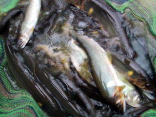 | とりあえず20匹キープです。 中瀬での実釣時間は4時間で 実際は30匹は越してますが再放流でした。 小物は天然物だと思います。 これがウジャウジャいるんですよ! ちゃんと育ったら7月には 宮川大爆釣間違いなし! チョッピリ川の状態が悪いですが 場所さえ間違わなければ 20cm程度なら釣れますよ♪ |