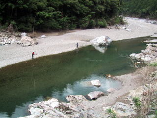 場所は、選びたい放題!大隈~荒瀬間4人(爆 僕は少し幅の狭くなった所に入りました。 丁度、以前あったハシゴのチョット上です。 鮎はホント、湧いてますが 僕の囮には見向きもしてくれません。 やっと掛かったのが開始2時間後_| ̄|○ そこから、7連チャン(☆_☆) 久々に釣ってる感じになってきたぞ!! |
