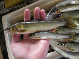 7月も半ばを過ぎ、鮎シーズン真っ盛りってとこでしょうか? しかし、やはり今年は生育が遅いのも事実。 まだ梅雨も明けてないのに気が早いのですかね(^^ゞ さて、一口に「鮎の友釣り」と言っても、人それぞれ色んな楽しみ方があるもんです。 綺麗な風景の中で、ノンビリ釣りを楽しむ方。 アレコレ仕掛に工夫を凝らし、自分だけのオリジナルで楽しむ方。 そして、今回ピックアップするのは「鮎の友釣り」で競う方々です。 ボツボツ始ってますね。友釣り大会! この地域でも大きな大会が2つ終わりました。 知り合いのネットトナメンターの皆さんが撃沈する中 ビックな大会でビックな成績を収めた方がいらっしゃいますヽ(`д´;)/ まっちゃ亭のtakaさんだ 大きな大会は全部日曜にやるもんだと思ってましたが この大会、僕の定休日にやってるではないですか。 何か色々もらえるんでしょ?クジ引きしたりして^^ 僕クジ運最強なんです。何か欲しいなぁ~ 先日も大会帰りのお客さんに ![]() この帽子頂きました♪カッコいい~~ おっと、話がソレてます・・・ 実はこの「まっちゃ亭のtakaさん」 同業者って事もあり(飯高でお店やられてます) 親近感&ライバル心があるんです(爆 まずい・・・takaさんが雲の上の人になってしまったヽ(;´Д`)ノ、 こちとら、大会といえば所属する会のものに参加するのみ。 いくら過去に優勝経験があるとはいえ takaさんのとは格式が違いすぎる・・・・_| ̄|○ (比べてはいけませんか?) しかし、今の僕に出来るのは「七鮎会」の大会で優勝する事のみ! ってな訳で、次週開催される大会会場 大内山川「岩船橋下流」の偵察に行ってまいりました。 解禁当初はブーイングの嵐だった大内山川も 持ち前の尻上がりでココに来て状況も好転。 ![]() 分りにくいですがかなり渇水気味ですが 垢腐れはまだ起こしてません。 ココは橋の直下から瀬~トロ~チャラ~瀬~淵 と様々なポイントが集まってて 色々な釣り方の勉強にはもってこい! しかし、今日は大会の為の斥候。 大会となれば大勢の人が(まぁ十数人ですが^^;)好ポイントに殺到する。 その身動きできない中、自分だけ動かずに釣れ続けるポイントを 極秘に入手しようって算段なんです( ̄ー ̄)ニヤリ 岩船橋より上はコンスタントに釣れてるので 人も数人見えてますが 下流は芳しくないらしく、僕のみの入川^^; とりあえず、中州に陣取り対岸のトロ場で様子見です。 水深は深くても20センチでしょうか? ビッシリ小石が敷き詰まってます。 養太郎君をセットし、トロをス~~~っと上らせると 3メートルも行かないうちに2匹の鮎がからみあうのが丸見えです^^ どうです?今年の1匹目の早さ。 まだ養次郎君を使った事がありません(自慢) しかし、17センチと小ぶり・・・ コレを囮にまたス~~~~と上らせると いや、今度は勝手に下がって行きます。エライ勢いで。 そのまま囮任せにしておくと即2匹目ゲットヽ(`д´;)/ しかし、これまた17センチと小ぶり・・・ この繰り返しで数匹掛けた所で 目印がぶっ飛ぶ20センチオーバーを入手。 ここで、コレを囮に写真手前の瀬に移動。 この頃になって、橋より下流の瀬付近に数名の釣り人が現れました。 やはり、流れのある瀬には大きいのが居ます。 アタフタしながら数匹を取り込み、徐々に釣り上がります。 何しろ、今日は爆釣ポイントを見つけるのが目的。 ココゾ!って所を発見するまで移動また移動です。 開始1時間で10匹を軽く越えてます。 凄いぞ!オレ!! 移動する時にね、囮を引船に仕舞うでしょ。 そして、次に出す時ドレが元気かな?って探すでしょ? ドレがナニだか分らなくなってきたんです(´Д`;) 鮎多すぎちゃってさ(爆 ココで強気のこてつ君。 養太郎&養次郎、早くも放流。 だって、この方の日記に舟に鮎が多いと酸欠で弱るって書いてあったし、 渇水で舟沈めても完全に沈んでないし・・・ まぁこんだけ鮎あれば何とでもなるでしょうって 短絡的な思考が働いただけなんですけどね。 しかし、ココは小石の多いポイント。 知らず知らずに、石でこすれてたのか そろそろ寿命だったのか、痛恨の親子ドンブリ_| ̄|○ 仕掛換えて、囮を放すと今度は空中糸と水中糸の結束の リリアンから水中糸外れてて知らぬ間に鮎放流。 ソレに気付かず、竿立てて目印探してた自分が情けないヽ(´・`)ノ 状況が一転してしまいました。 数的にはマイナス2匹なのですが 心理的に切迫感を感じます。 再度仕掛を出し、キツメのチャラを上らせると ギュンギュン! こりゃぁ、デカイ!と即分る!! 川中を狭しと暴れ狂うヽ(`д´;)/ バシャ! おや?ジャンプですか? その御姿は・・・やはりニゴイ(TOT) 皆さん、気をつけて下さいね。 イッパイ居ますから・・・ニゴイΣ°))))彡バシャ! 幸い?鼻環の所で切れてくれました ココで、さっきの養太郎&養次郎放流が悔やまれます。 小ぶりの鮎しか残ってません。 またトロを下から根気良く上らせて ポツポツ釣り囮を貯めます。 爆釣ポイント探しのはずが 一日釣り凌ぐ為の囮捕りへと釣りが変わってしま