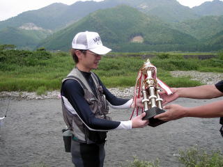 とうとうこの日がやってきましたヽ(`д´;)/ そうです、年に一度だけ僕が人と競い合う友釣りをする日。 ★七鮎会大友釣り大会IN大内山川★ 休みが水曜だけの僕は滅多に人と一緒に友釣りする機会がございません。 只黙々と一人ぼっちで友釣りをする僕は 年々、孤高の老人の如く寡黙で気難しい爺さんになってきてませんか? 出来れば、この方の様に ![]() って常に冷静・温厚・無欲に会話の出来る釣り師になりたいもんです。 さて、そんな僕ですが今回の大会に賭ける意気込みだけは相当なもんでした。 解禁前から<優勝>のみを目標とし着々を心身ともに鍛錬を積んできました。 その模様はこちらに書いてありますのでご参考までに^^; 大会前夜祭で、チョッピリやりすぎて目覚めた時はまだ酔っ払ってました(*´∀`)ノ ムカつく胃に無理矢理コンビニで買ったサンドイッチを押し込み川原に向かいます。 あれだけダラケテた気分も川を見て一気に戦闘モードに突入! 会員さんと会話しながらも、その目は川から離れる事はありません。 鮎が跳ねてる場所や、流れ・川の色をジッと観察します。 いや、これはもう観察と言うより 目で犯す! そんな犯罪の領域にさしかかっていたかもしれません。 ![]() ▲優勝トロフィーもそっちのけで川を目で犯すこてつの図▲ 大会委員長の寝坊(爆)で開始が予定より若干遅れてしまいましたが いつもの様にクジ引きで入川順番を決めます。 もちろん、こてつは1番クジゲットヽ(`д´;)/ 幸先の良い出だしです^^ 3箇所考えていたのですが、最悪釣り下れるって事で 上流部の瀬の開きに朝一は入ってみる事にしたんです。 今年は開始数秒~数分で1匹目を確実に掛けてきたこてつ。 1番良さそうなポイントって事もあり、速攻逃げ切りを想定してたのですが おや?どうしちゃったのかな??今日は?? 中々1匹目が来ません(´Д`;) 下手の選手が順調に掛けてるのがかなり気になります。 1時間経過ヽ(;´Д`)ノ、 まだボウズです。しかも養次郎まで発進してしまってます。 ようやくコッ!って当たりらしきものがあったので寄せてみると煮干の様な鮎・・・ あ・・・あかん・・・もう我慢できへんε=(>ε<) プッー! 実は、昨夜の調整の後遺症でお腹がユルクなってまして^^; コレもあったので、トイレが近いココを選んだのもあったんです。 ダッシュで川を横切り、岩船常設トイレに駆け込むこてつ_| ̄|○ すっきり落ち着いた所で、気分一新仕切り直しです。 再度、川を目で犯しポイントを見極めるこてつ。 ポツポツ掛かり出した頃、「こてつ私設応援団」の到着です。 この方です ![]() 釣りマンさんです(爆)役者やのぉ~~~! 対面の堤防から何か言ってます。 「そこな、バリカップで撃沈したとこやで(^o^)/~~~」 ( ゜Д゜)ハッ そうか、ココは見た目良さそうだから、毎日毎日誰かが攻めてるはずだ。 バリカップでは釣りマンさん&deibuさんがそろって悔しい思いをした場所だ。 怨念付いてますがな・・・ココ(´Д`;) いや、怨念と言うより、見た目程しがみつく場所では無いと思ったし このままでは、最下位決定間違いなし! 当初の計画通り、人の間を縫って釣り下がる事に作戦を変更しました。 ![]() ▲ドツボにはまってるこてつの図(写真提供釣りマン氏)▲ 僕の予想では20匹が優勝と踏んでいたので この時点で、もはや優勝はあきらめ、いかにカッコ付けて収めるかが最重要ミッション。 だってさ、今年調子良かったから 優勝候補の筆頭だったでしょ・・・ ドベだったら、最高の酒の肴になってしまいますやンヽ(;´Д`)ノ、 出来るだけ、まだ誰も竿を差して無さそうなグレーポイントを次々を攻めましたよ。 3連覇を成し遂げてる方は、朝から同じ場所でコンスタントに釣り上げてます。流石! 何が違うんでしょうね? そんな他人の勇姿を目の端でとらえながら、ここまで拾った鮎6匹。 残り時間はあと僅か・・・・ あ~~~あ、やっちゃったな・・・オレ(´Д`;)ハァ~~ もう、集合場所まで下がってきてしまいました。 でもね、実は朝から一番気になってたポイントがココなんです。 最下位脱出に望みを掛けて、数匹拾わせて頂こうか・・・ そして、本日最大の見せ場がやってきました。 こてつ君 鬼掛かりヽ(`д´;)/ キタ━━━━(゜∀゜)━━━━!!!!!! しかし、時間がありません。 あせってはミスが重なるので、持ち前の異常な集中力を発揮(☆_☆) もう数なんて数えてません。 五感の全てを囮・目印・竿からの振動に注ぎ込んでます。 あっと言う間に、はい終了時間です~~~(TOT) どうせ、上位には入れないと思ったので数も数えず皆の所に戻ると トップは3連覇した方の15匹!(囮除く) 2位は7匹!(囮除く) (゜Д゜≡゜Д゜)?はぁ?7匹って? そんなら、僕って2位になってるやん!? 再度、引き舟の所に戻り数を数えると 15匹(囮除く)で1位タイε=(>ε<) プッー! こてつ君 なんちゃって優勝ですo(><o)(o><)o ラスト1時間弱で9匹釣ってました。 3連覇された方とキッチリ勝負付けしたかったのですが 僕の燃える様な闘志に恐れをなし、逃げられました。 (い