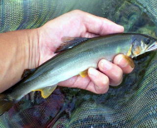 皆さんが好ポイントに向かってジャブジャブ歩いていくトコです。 水深は深くて15センチ位、中洲付近は5センチ無いです。 囮をセットし下から上へと泳がすと バシャバシャ☆ 水深無いから、掛かった鮎が暴れて飛び跳ねてます>< いきなりだったので正直何事かと思いましたよ^^; そして囮を天然に変えると、またすかさず バシャバシャ☆ |