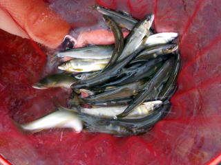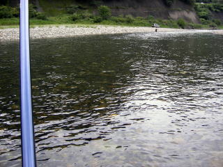 先日ネット鮎仲間のハルさん御一行がね 2001年のガマのチャンピオンをお店に連れて来てくれたんですよ。 やっぱ、色々質問したいでしょ?そんな方には。 仕掛けとかポイントの選択とかイッパイ聞きたい事があったんですが いざ目の前にして口から飛び出した言葉は 「あのぉ~~~ やっぱりさぁ~ 夏場は仕事しないで毎日川行ってるの?」 (゜Д゜≡゜Д゜)? 自分自身あまりの不甲斐なさに涙がこぼれそうなこてつです_| ̄|○ おっと、仕事と言えばお店にキャイ~ンのウドちゃん来たよ! 今週9月9日(土)AM9:30~名古屋テレビ(メ~テレ) 『ウドちゃんの旅してゴメン!』 で放送されるから、釣行前にビデオ撮っといてね♪ その他の地域の方は数週間遅れだけど HTB(北海道テレビ)火曜25:15~25:45 KFB(福島放送) 土曜17:00~17:30 TVS(テレビ埼玉) 金曜21:00~21:30 HAB(北陸朝日放送) 金曜25:20~25:50 さて、鮎の季節も残す所あと1ヶ月! ここ2週間完全に凹んでるんで何かキッカケが欲しい所に一通の携帯メールが 「今週熊野に行きませんか?」 鮎友達のファイヤーマン1号からだ。 何故か、いつも連絡はメールでやりとりする怪しい関係だ。 二つ返事で連れてってもらう事にしました。 こてつ遠征決定! しかし、地元密着の鮎師の僕です。 勢い良くOK返事したものの、様々な不安が頭に浮かんできますヽ(;´Д`)ノ、 熊野って普通の仕掛けでエエんやろか? 水中糸ってどれくらい取ったらエエんやろ? 針のサイズは7号でも小さいって聞いた事あるけど? 釣行前夜、再度ファイヤーマン1号にメールするこてつ(ヨワヨワです^^;) 『囮缶とクーラーは一緒に使うから持っていかんでいい?』 返ってきたメールがこうだヽ(`д´;)/ 『大漁で入らんといかんで持ってってください』 (゜Д゜≡゜Д゜)?ナヌ (゜Д゜≡゜Д゜)?ナヌ (゜Д゜≡゜Д゜)?ナヌーーーーーー!! 噂に聞いてた 「午前中に50匹は釣れる」 って本当なんですかヽ(`д´;)/ 一番大きなクーラー用意してイザ熊野に出発だい!(爆 前回の下見(汗)でおおよその道順も時間も把握してたので 助手席でペース配分を考えながらヨタ話ネタを炸裂させつつ何とか熊野川に到着 ![]() 川も広けりゃ川原も広い(≧∇≦) 写真は道の駅らしきとこからの風景です。熊野川ね。 どうも、十津川と北山川が合流すると熊野川になるみたいですね。 そんな事すら知らずに遠征とは、参りましたか? で、今日は胸まで立ち込み断固拒否権を発令してあったので 十津川って方に行くらしいみたいです。 囮店はネットでも目にした事もある床屋さん。 丁度囮屋さんに着いた時に、後ろから三重ナンバーの車もやってきて停車。 囮缶に住所と名前が書かれてたのを素早くチェック。 なんと、名張からやってきたみたいです{{(>_<)}} 「兄さん、名張川もあるのに、よ~~こんな遠くまで来たな(≧∇≦)」 「でも大台でしたら大内山も宮川もありますやん(*´∀`)ノ」 と朝からナイスな突っ込みで返され一本取られたこてつ。 川で再会したら囮を分けてもらう事を固く約束して兄さんと別れ 目的のポイントに向かいました。 えっとね、何てトコだか分りません・・・ヽ(;´Д`)ノ、 ![]() ココです。 既にヨリが打たれてますが、見た目チャピチャピ♪ 囮缶漬けに行ったらヨリの上で鮎が走るのを目認! 正直、知らない川なので、せめてツ抜けしないとと思ってたのですが 目標上方修正! <やっぱり午前中50匹釣れるんですか?俺?> ↑熊野の神々に聞いてます 僕はヨリから上流へ、ファイヤーマン1号は下流へと釣り始めました。 しかし、川に入ってみるとさっき見たはずの鮎は居ません。 得意のチャラチャラなので、上に上に囮を泳がせて付いて行きますが音沙汰無し。 かなり広範囲に探り、かなり上流まで行きましたが追われる気配すら無し(´Д`;) そこで、人が釣らなさそうな所 端っこの50センチ程の分流に上らせると ゴン! と明確な当たり( ゜Д゜)ハッ 竿を立てると一気に走り始めました!!かなり強烈です!!! 取り込んだのは18センチ程度の鮎だったのですが この強烈な当たり&引きは、皆さんが熊野の虜になる所以なんでしょうね。 鮎も、ヌメヌメピカピカで良い香り^^ 野鮎を手にしたらもうコッチのモンです。 サイズの割に元気イッパイです! ギュンギュン上って行って、サクサクっと根掛かり(´Д`;) 浅いので舟をその場に置いて外しに行って戻ってくると おや?僕の舟、何処に置いたのかなぁw(°o°)wポケ~~~ ものの見事に舟流してしまいました\(◎o◎)/! 地元の川だと石が大きいので、舟に付けてるイカリが引っ掛かるのですが どうもココは小石ばかりなので、引っ掛からずに流れてしまった様です^^; しかし、下流にはヨリが打ってあるのでそこで必ず止まります。 竿を置いて舟を捜索に向かい無事回収 再度、竿の所に戻り釣り再開しようと竿立てたら 仕掛け切れてて、さっきの野鮎を放流してました(TOT) 坊主 この言葉が脳裏を横切り始めました。 最悪の展開に次ぐ展開です。ほぼあり得ない状況です。 またまた、養殖に登場願い広範囲に探りますが掛かりません。 時間だ