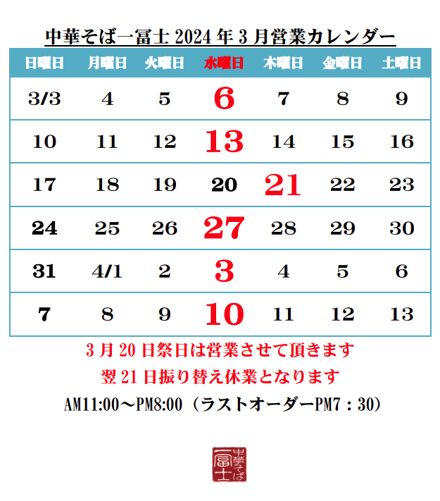 3月20日祭日は営業させて頂き、翌21日を振り替え休業です