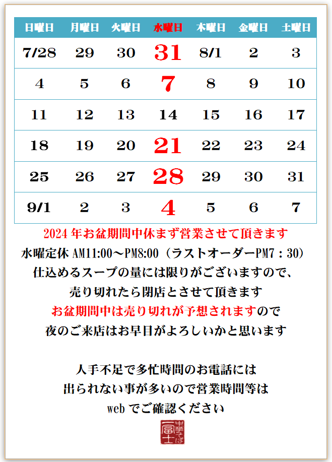 8月のお盆期間は休まず営業させて頂きますのでよろしくお願いいたします。