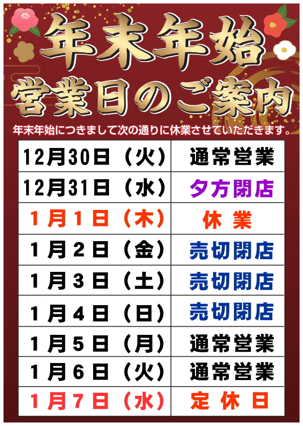 新春は元旦のみお休みで、2日からの営業となりますのでよろしくお願いいたします。